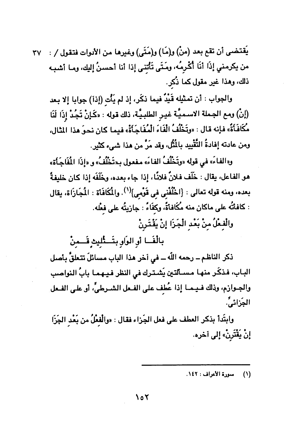 وابتدأ بذكر العطف على فعل الجزاء فقال: "والفعل من بعد الجزا إن يقترن" إلى آخره.