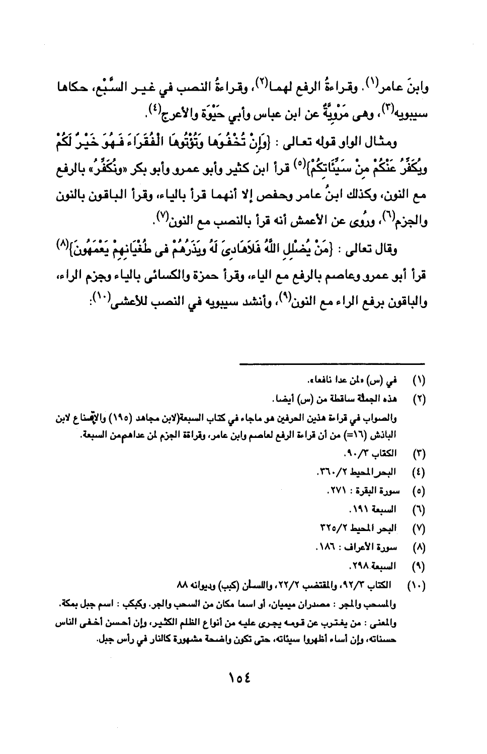 وقال تعالى: } من يضلل الله فلا هادي له ويذرهم في طغيانهم يعمهون} قرأ أبو عمرو وعاصم بالرفع مع الياء، وقرأ حمزة والكسائي بالياء وجزم الراء، والباقون برفع الراء مع النون، وأنشد سيبويه في النصب للأعشى: