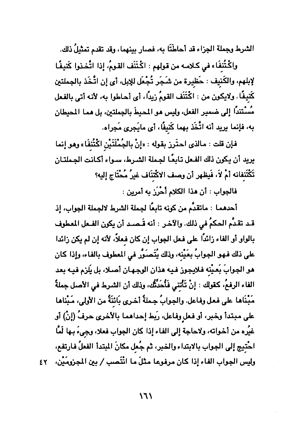 فإن قلت: ما الذي احترز بقوله: "عن بالجملتين اكتنفا" وهو إنما يريد أن يكون ذلك الفعل تابعا لجملة الشرط، سواء أكانت الجملتان تكتنفانه أم لا، فيظهر أن وصف الاكتناف غير محتاج إليه ..
