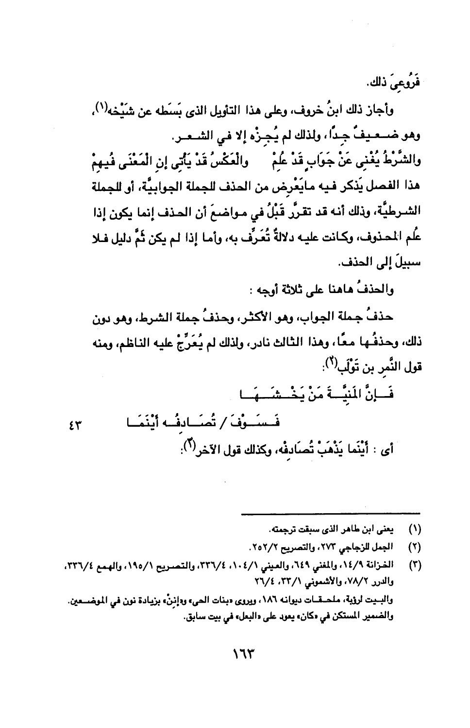 هذا الفصل يذكر فيه ما يعرض من الحذف للجملة الجوابية، أو للجملة الشرطية، وذلك أنه قد تقرر قبل في مواضع أن الحذف إنما يكون إذا علم المحذوف، وكانت عليه دلالة تعرف به، وأما إذا لم يكن ثم دليل فلا سبيل إلى الحذف.