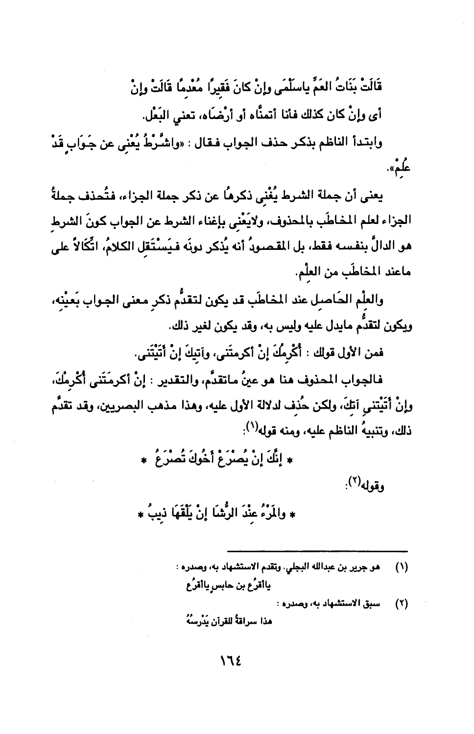 وابتدأ الناظم بذكر حذف الجواب فقال: " واشرط يعني عن جواب قد علم".