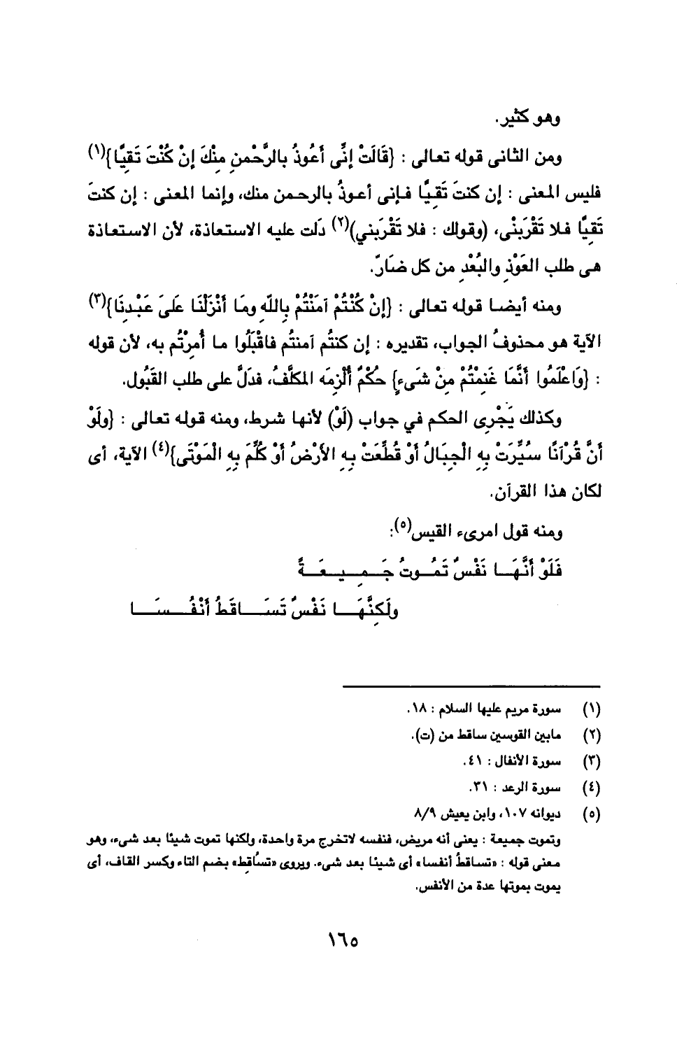 ومن الثاني قوله تعالى: } قالت إني أعوذ بالرحمن منك إن كنت تقيا} فليس المعنى: إن كنت تقيا فإني أعوذ بالرحمن منك، وإنما المعنى: إن كنت تقيا فلا تقربني، (وقولك: فلا تقربني) دلت عليه الاستعاذة، لأن الاستعاذة هي طلب العوذ والبعد من كل ضار.