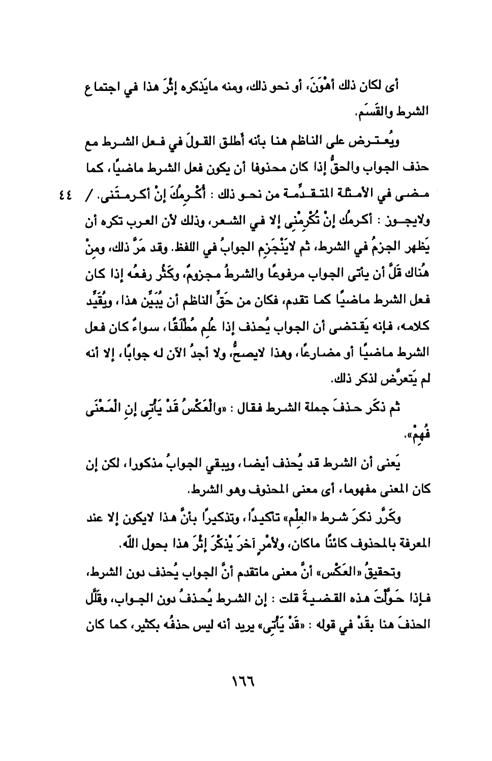 ويعترض على الناظم هنا بأنه أطلق القول في فعل الشرط مع حذف الجواب والحق إذا كان محذوفا أن يكون فعل الشرط ماضيا، كما مضى في الأمثلة المتقدمة من نحو ذلك: أكرمك إن أكرمتني/ ولا يجوز: أكرمك إن تكرمني إلا في الشعر، وذلك لأن العرب تكره أن يظهر الجزم في الشرط، ثم لا ينجزم الجواب في اللفظ. وقد مر ذلك، ومن هناك قل أن يأتي الجواب مرفوعا والشرط مجزوم، وكثر رفعه إذا كان فعل الشرط ماضيا كما تقدم، فكان من حق الناظم أن يبين هذا، ويقيد كلامه، فإنه يقتضي أن الجواب يحذف إذا علم مطلقا، سواء كان فعل الشرط ماضيا أو مضارعا، وهذا لا يصح، ولا أجد الآن له جوابا، إلا أنه لم يتعرض لذكر ذلك.