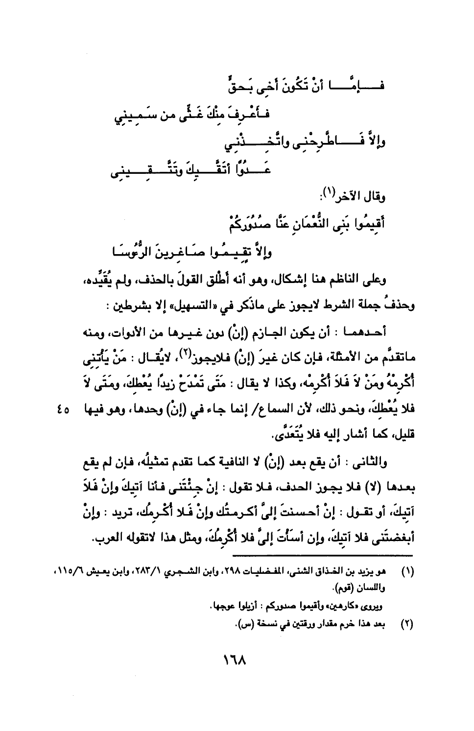 وعلى الناظم هنا إشكال، وهو أنه أطلق القول بالحذف، ولم يقيده، وحذف جملة الشرط لا يجوز على ما ذكر في "التسهيل" إلا بشرطين: