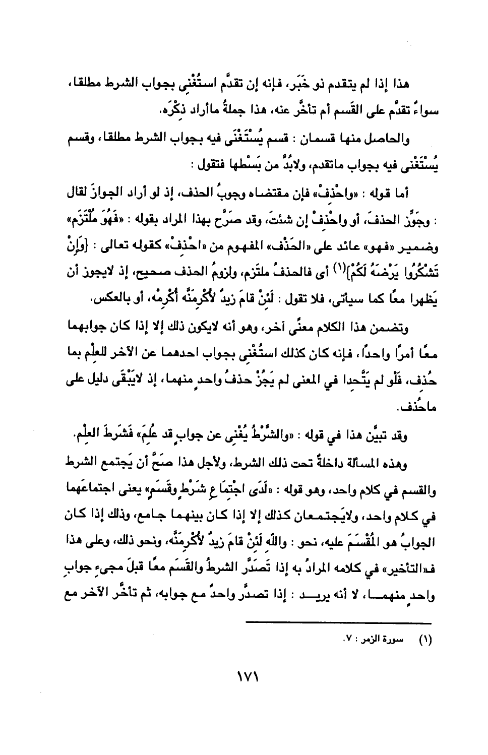 وهذه المسألة داخلة تحت ذلك الشرط، ولأجل هذا صح أن يجتمع الشرط والقسم في كلام واحد، وهو قوله: "لدي اجتماع شرط وقسم" يعني اجتماعهما في كلام واحد، ولا يجتمعان كذلك إلا إذا كان بينهما جامع، وذلك إذا كان الجواب هو المقسم عليه، نحو: والله لئن قام زيد لأكرمته، ونحو ذلك، وعلى هذا ف"التأخير" في كلامه المراد به إذا تصدر الشرط والقسم معا قبل مجئ جواب واحد منهما، لا أنه يريد: إذا تصدر واحد مع جوابه، ثم تأخر الآخر مع