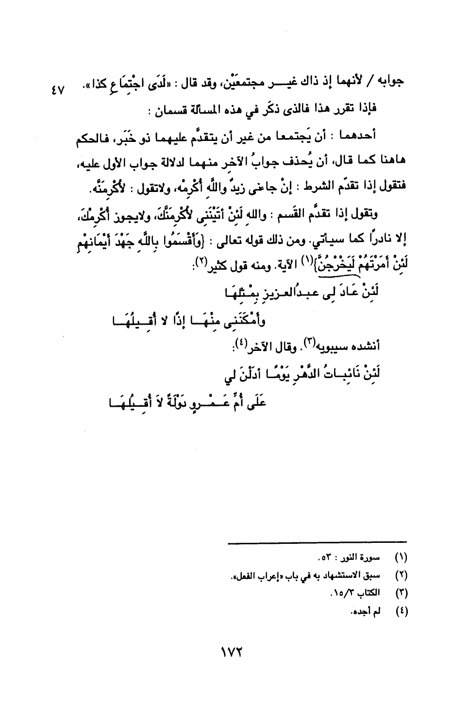 وتقول إذا تقدم القسم: والله لئن أتيتني لأكرمنك، ولا يجوز أكرمك، إلا نادرا كما سيأتي. ومن ذلك قوله تعالى: } وأقسموا بالله جهد أيمانهم لئن أمرتهم ليخرجن} الآية. ومنه قول كثير.