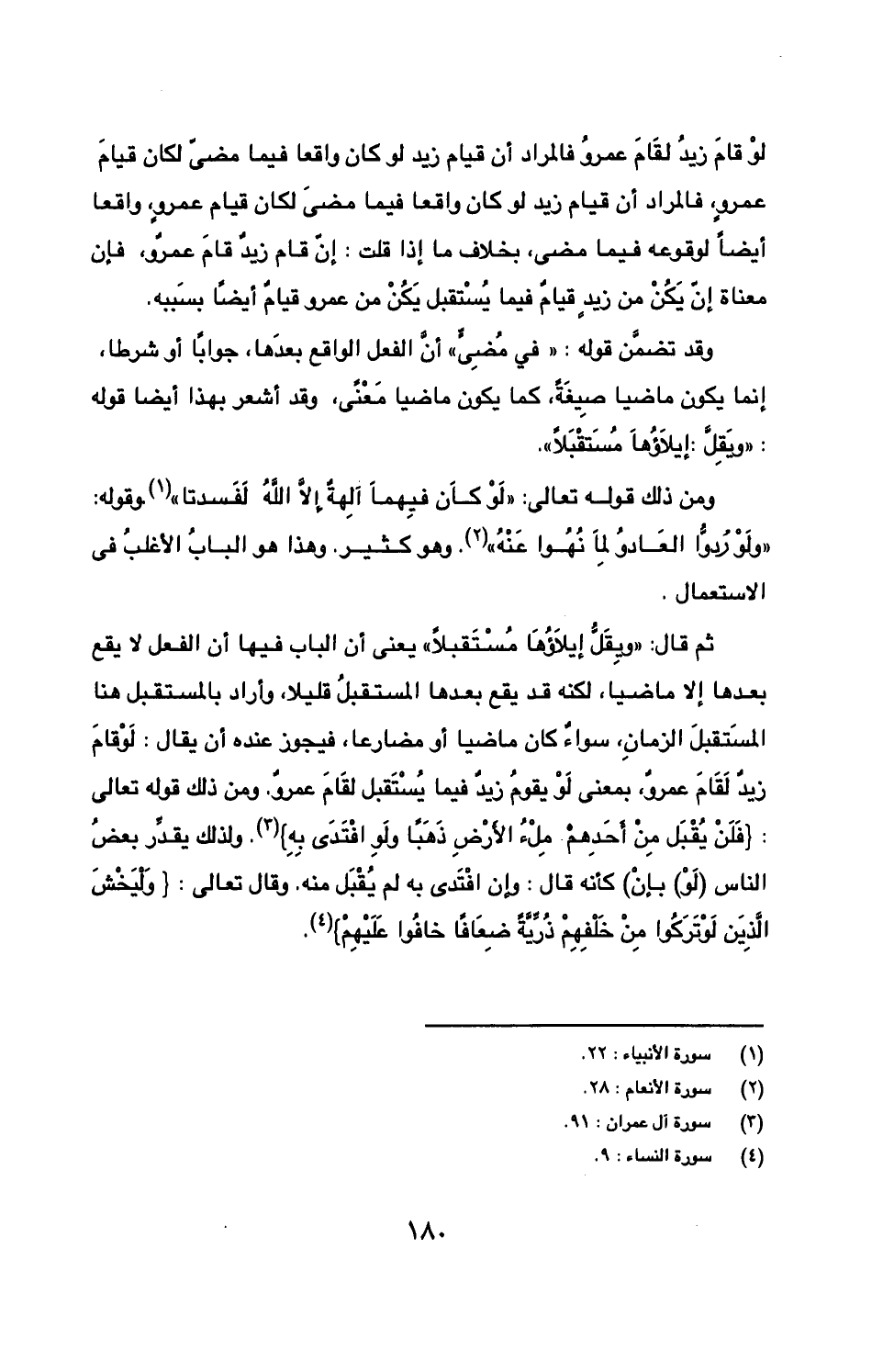 لو قام زيد لقام عمرو فالمراد أن قيام زيد لو كان واقعا فيما مضى لكان قيام عمرو، فالمراد أن قيام زيد لو كان واقعا فيما مضى لكان قيام عمر، واقعا أيضا لوقوعه فيما مضى، بخلاف ما إذا قلت: إن قام زيد قام عمرو، فإن معناه إن يكن من زيد قيام فيما يستقبل يكن من عمرو قيام أيضا بسببه.