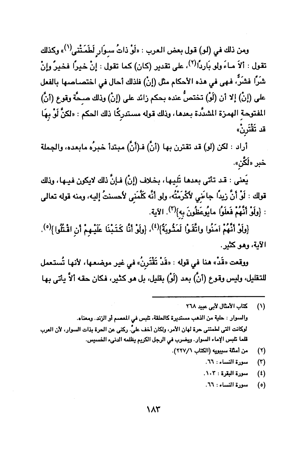 ومن ذلك في (لو) قول بعض العرب: "لو ذات سوار لطمتني" وكذلك تقول: ألا ماء ولو باردا، على تقدير (كان) كما تقول: إن خيرا فخير وإن شرا فشر، فهي في هذه الأحكام مثل (إن) فلذلك أحال في اختصاصها بالفعل على (إن) إلا أن (لو) تختص عنده بحكم زائد على (إن) وذلك صحة وقوع (أن) المفتوحة الهمزة المشددة بعدها، وذلك قوله مستدركا ذلك الحكم: "لكن لو بها قد تقترن".