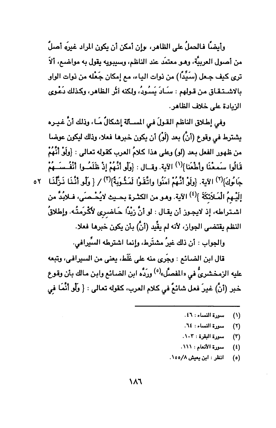 وفي إطلاق الناظم القول في المسألة إشكال ما، وذلك أن غيره يشترط في وقوع (أن) بعد (لو) أن يكون خبرها فعلا، وذلك ليكون عوضا من ظهور الفعل بعد (لو) وعلى هذا كلام العرب كقوله تعالى: } ولو أنهم قالوا سمعنا وأطعنا} الآية. وقال: } ولو أنهم إذ ظلموا أنفسهم جاءوك} الآية.} ولو أنهم آمنوا واتقوا لمثوبة} /} ولو أننا نزلنا إليهم الملائكة} الآية. وهو من الكثرة بحيث لا يحصى، فلا بد من اشتراطه، إذ لا يجوز أن يقال: لو أن زيدا حاضري لأكرمته. وإطلاق النظم يقتضي الجواز، لأنه لم يقيد (أن) بأن يكون خبرها فعلا.