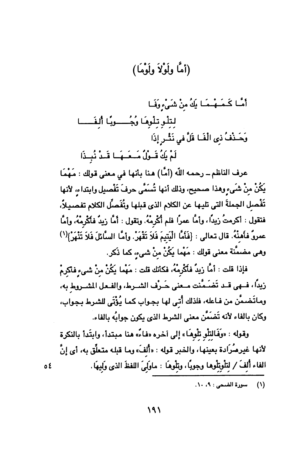عرف الناظم- رحمه الله (أما) هنا بأنها في معنى قولك: مهما يكن من شيء وهذا صحيح، وذلك أنها تسمى حرف تفصيل وابتداء، لأنها تفصل الجملة التي تليها عن الكلام الذي قبلها وتفصل الكلام تفصيلا، فتقول: أكرمت زيدا، وأما عمرا فلم أكرمه. وتقول: أما زيد فأكرمه، وأما عمرو فأهنه. قال تعالى: } فأما اليتيم فلا تقهر. وأما السائل فلا تنهر} وهي مضمنة معنى قولك: مهما يكن من شيء، كما ذكر.