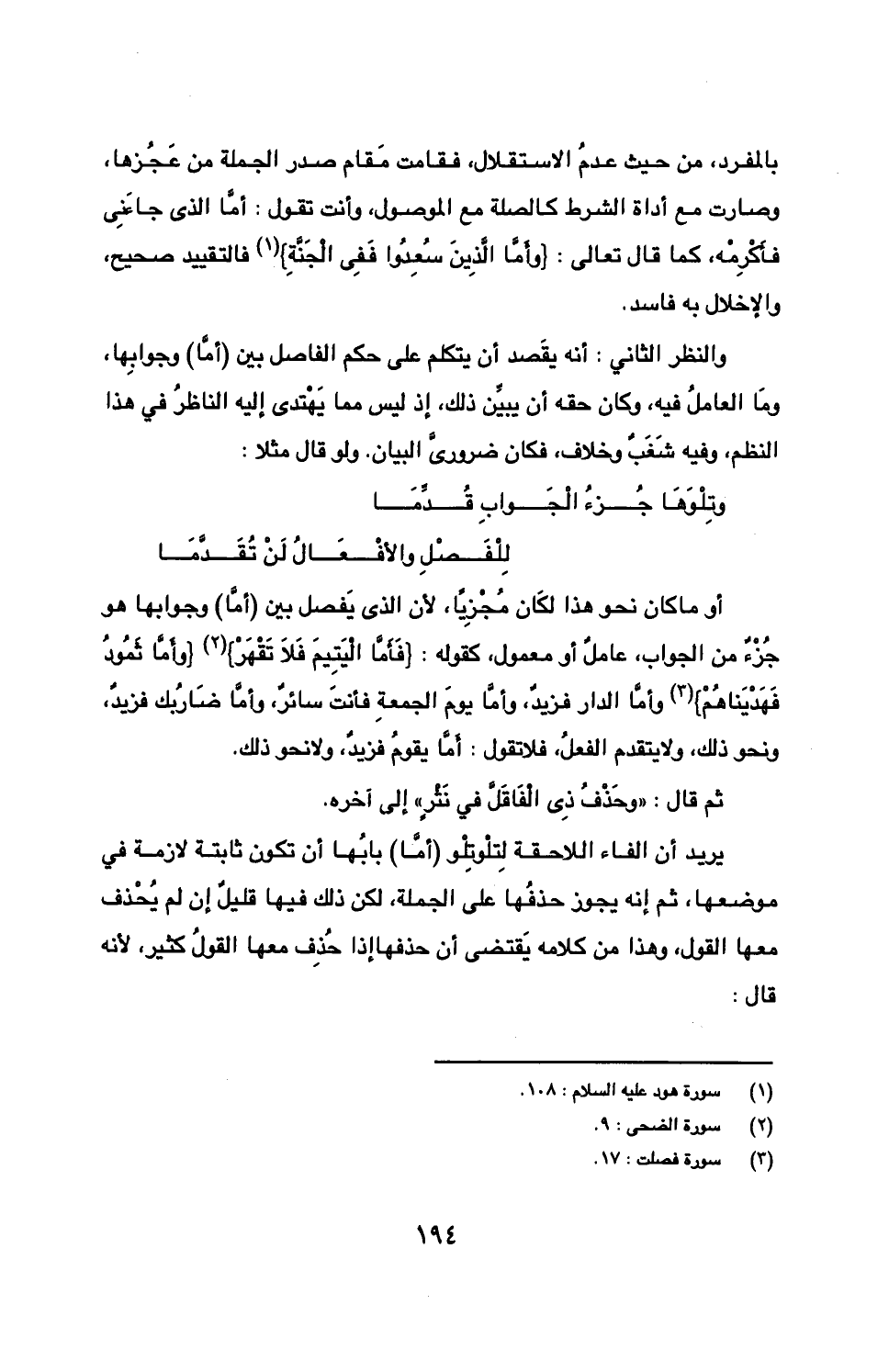 بالمفرد، من حيث عدم الاستقلال، فقامت مقام صدر الجملة من عجزها، وصارت مع أداة الشرط كالصلة مع الموصول، وأنت تقول: أما الذي جاءني فأكرمه، كما قال تعالى: } وأما الذين سعدوا ففي الجنة} فالتقييد صحيح، والإخلال به فاسد.