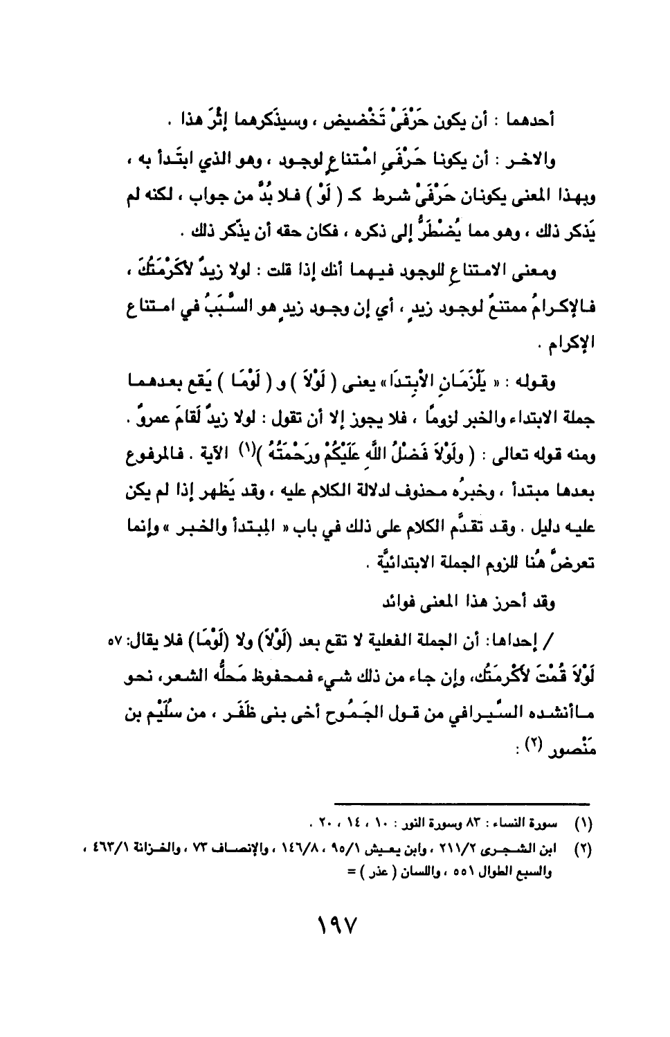 ومعنى الامتناع للوجود فيهما أنك إذا قلت: لولا زيد لأكرمتك، فالإكرام ممتنع لوجود زيد، أي إن وجود زيد هو السبب في امتناع الإكرام.