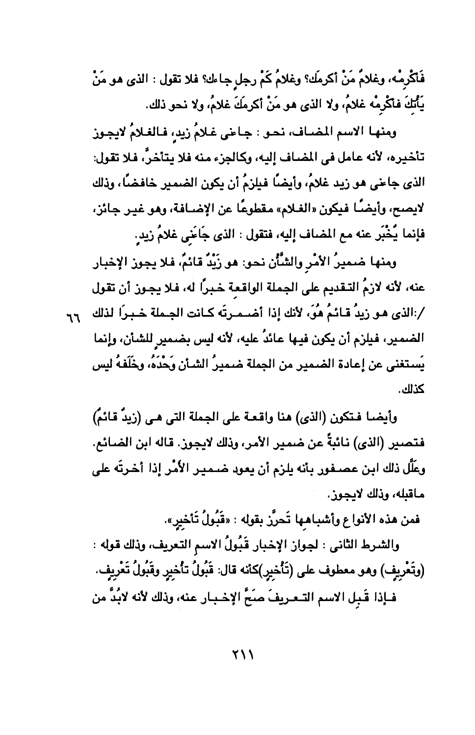 ومنها الاسم المضاف، نحو: جاءني غلام زيد، فالغلام لا يجوز تأخيره، لأنه عامل في المضاف إليه، وكالجزء منه فلا يتأخر، فلا تقول: الذي جاءني هو زيد غلام، وأيضا فيلزم أن يكون الضمير خافضا، وذلك لا يصح، وأيضا فيكون "الغلام" مقطوعا عن الإضافة، وهو غير جائز، فإنما يخبر عنه مع المضاف إليه، فتقول: الذي جاءني غلام زيد.