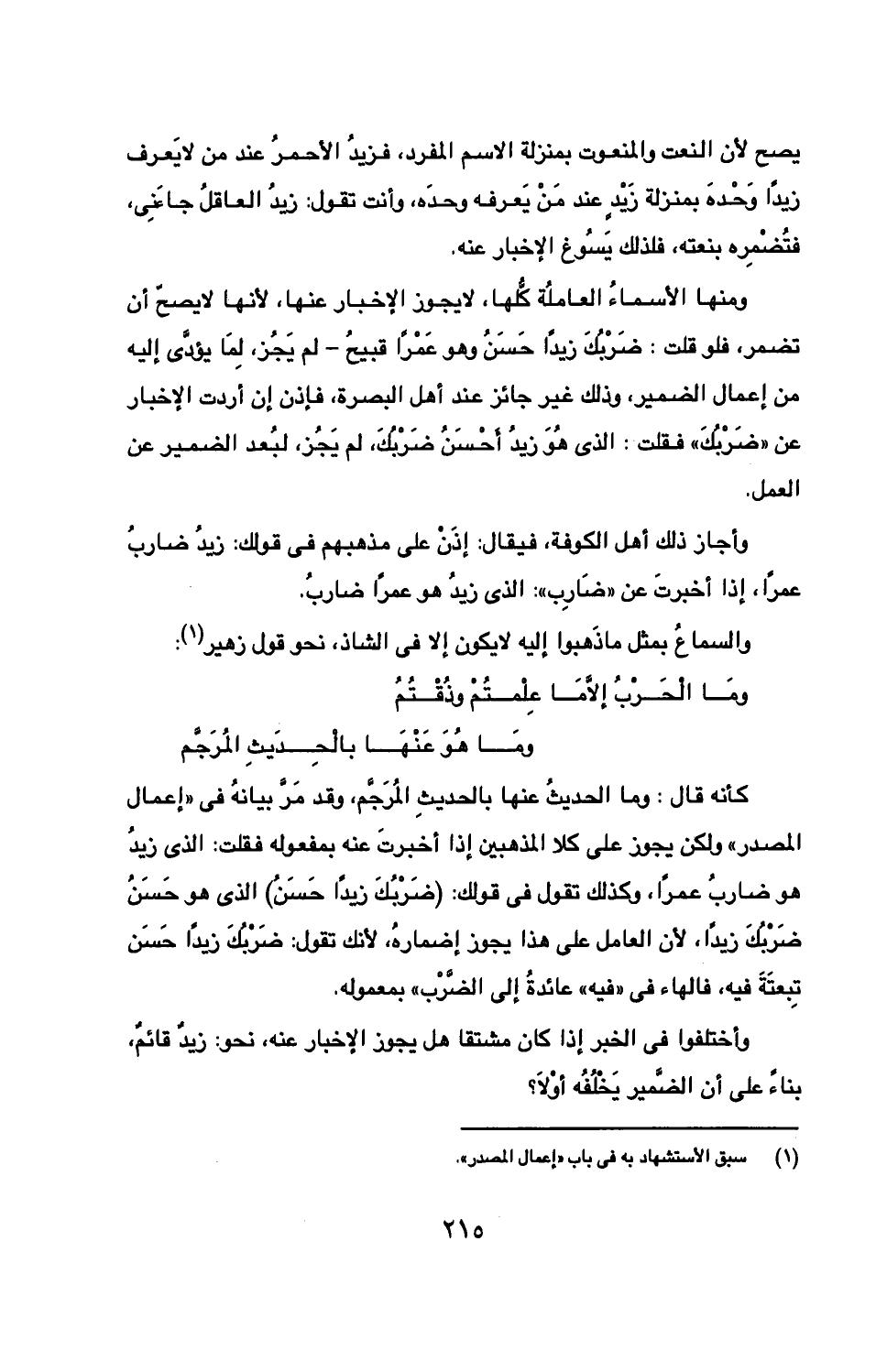 كأنه قال: وما الحديث عنها بالحديث المرجم، وقد مر بيانه في "إعمال المصدر" ولكن يجوز على كلا المذهبين إذا أخبرت عنه بمفعوله فقلت: الذي زيد هو ضارب عمرا، وكذلك تقول في قولك: / (ضربك زيدا حسن) الذي هو حسن ضربك زيدا، لأن العامل على هذا يجوز إضماره، لأنك تقول: ضربك زيدا حسن تبعتة فيه، فالهاء في "فيه" عائدة إلى الضرب" بمعموله.