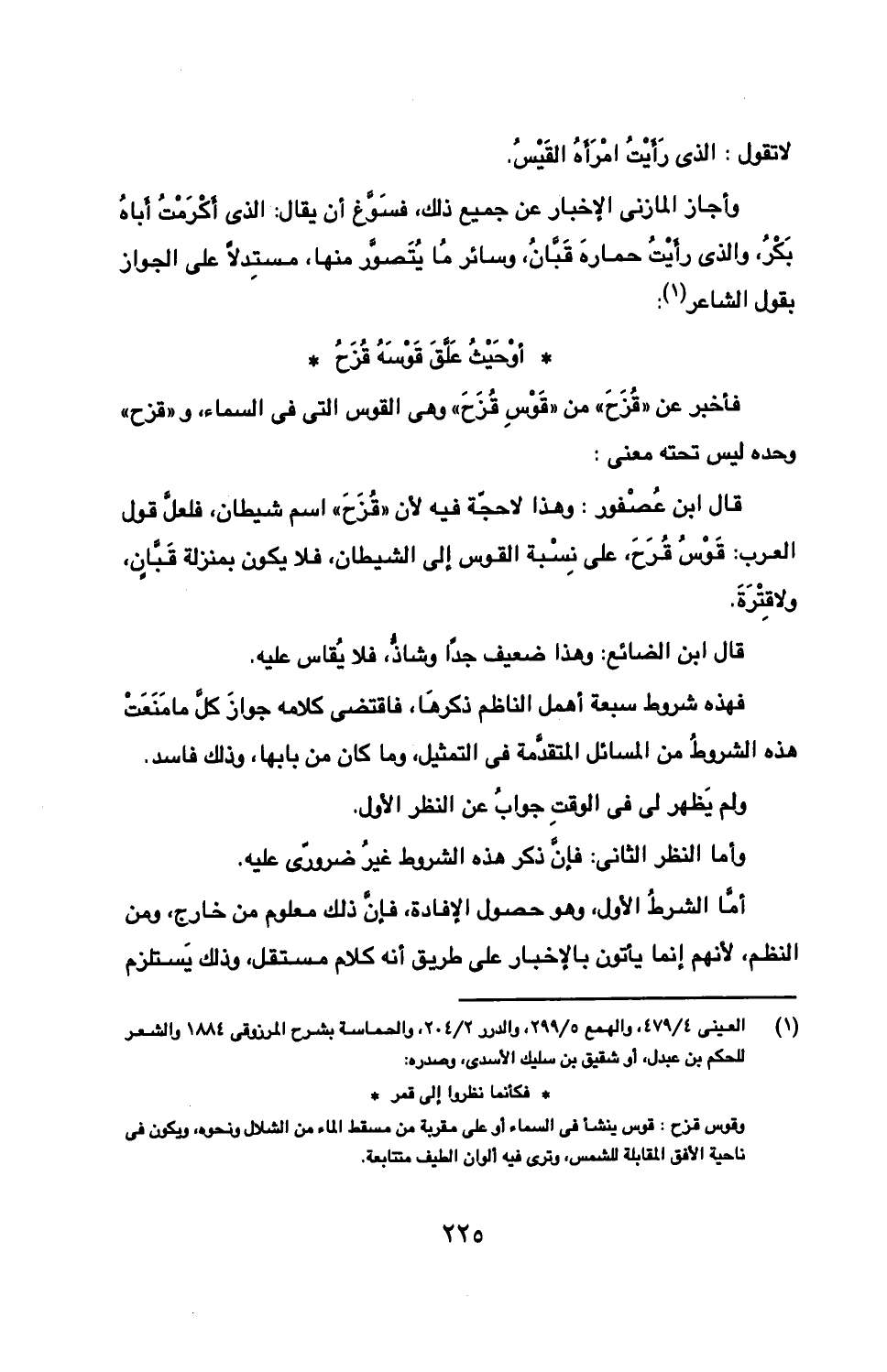 قال ابن عصفور: وهذا لا حجة فيه لأن "قزح" اسم شيطان، فلعل قول العرب: قوس قزح، على نسبة القوس إلى الشيطان، فلا يكون بمنزلة قبان، ولا قترة.