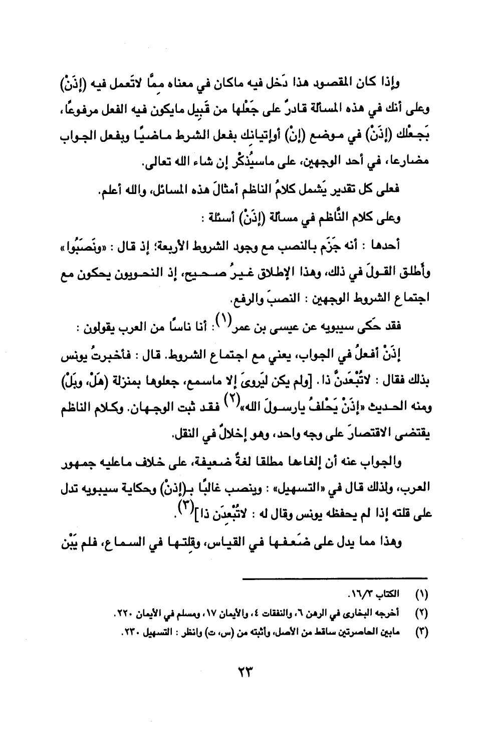 والجواب عنه أن إلغاءها مطلقا لغة ضعيفة، على خلاف ما عليه جمهور العرب، ولذلك قال في "التسهيل": وينصب غالبا ب (إذن) وحكاية سيبويه تدل على قلته إذا لم يحفظه يونس وقال له: لا تبعدن ذا [.