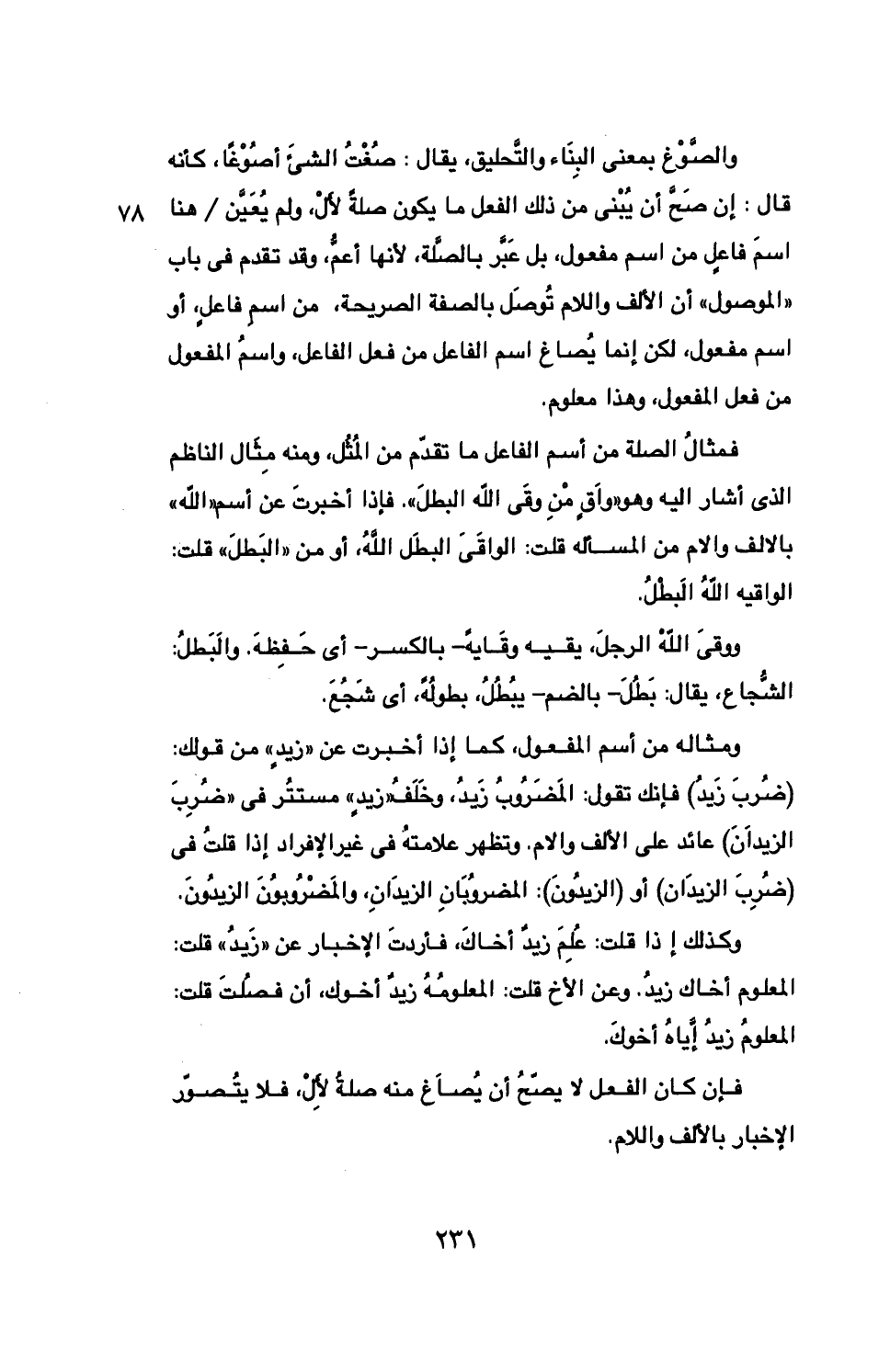 ومثاله من اسم المفعول، كما إذا أخبرت عن "زيد" من قولك: (ضرب زيد) فإنك تقول: المضروب زيد، وخلف "زيد" مستتر في "ضرب الزيدان) عائد على الألف واللام، وتظهر علامته في غير الإفراد إذا قلت في (ضرب الزيدان) أو (الزيدون): المضروبان الزيدان، والمضروبون الزيدون.