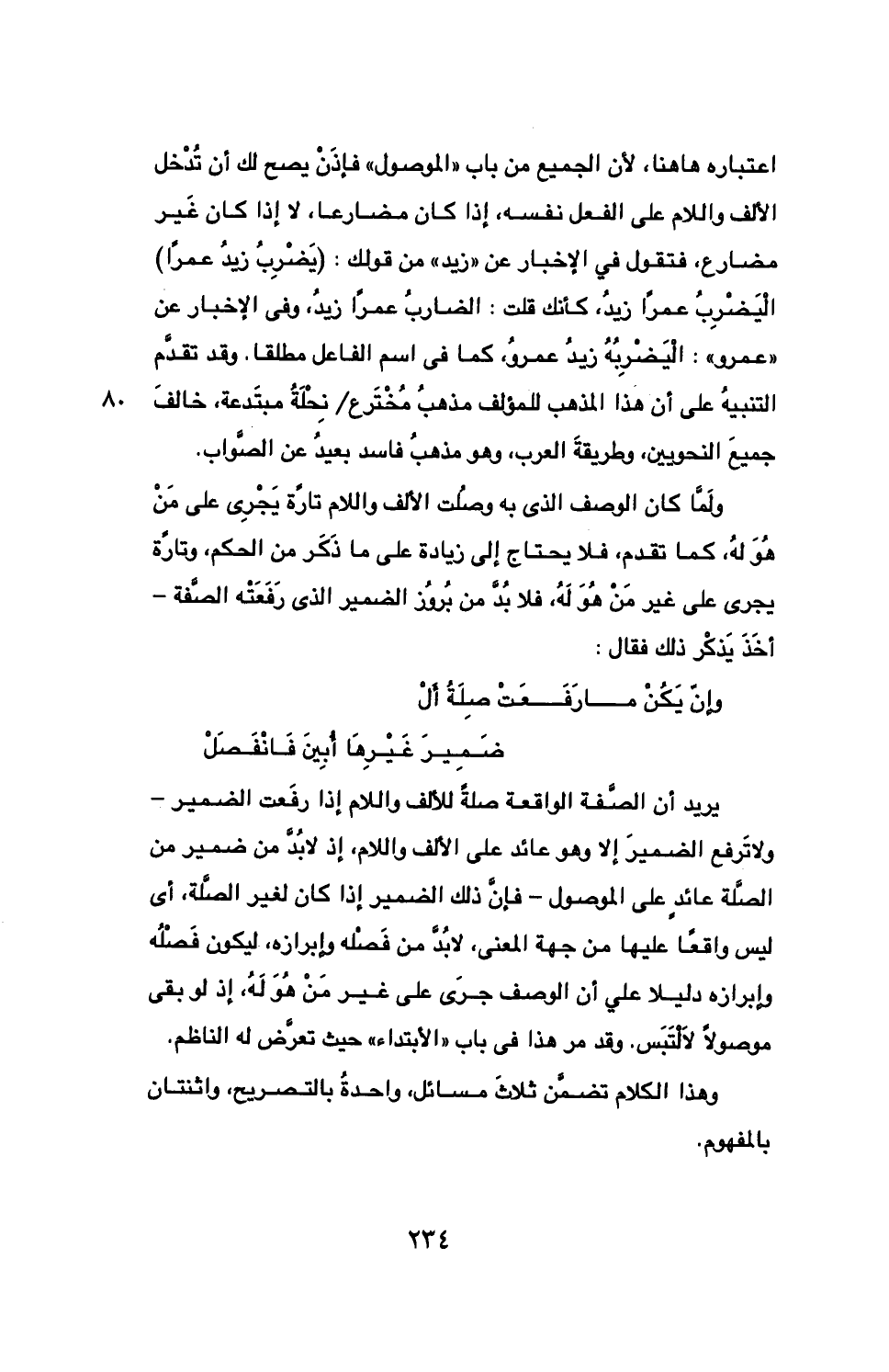 اعتباره هاهنا، لأن الجميع من باب "الموصول" فإذن يصح لك أن تدخل الألف واللام على الفعل نفسه، إذا كان مضارعا، لا إذا كان غير مضارع، فتقول في الإخبار عن "زيد" من قولك: (يضرب زيد عمرا) اليضرب عمرا زيد، كأنك قلت: الضارب عمرا زيد، وفي الإخبار عن "عمرو": اليضربه زيد عمرو، كما في اسم الفاعل مطلقا. وقد تقدم التنبيه على أن هذا المذهب للمؤلف مذهب مخترع/ نحلة مبتدعة، خالف جميع النحويين، وطريقة العرب، وهو مذهب فاسد بعيد عن الصواب.