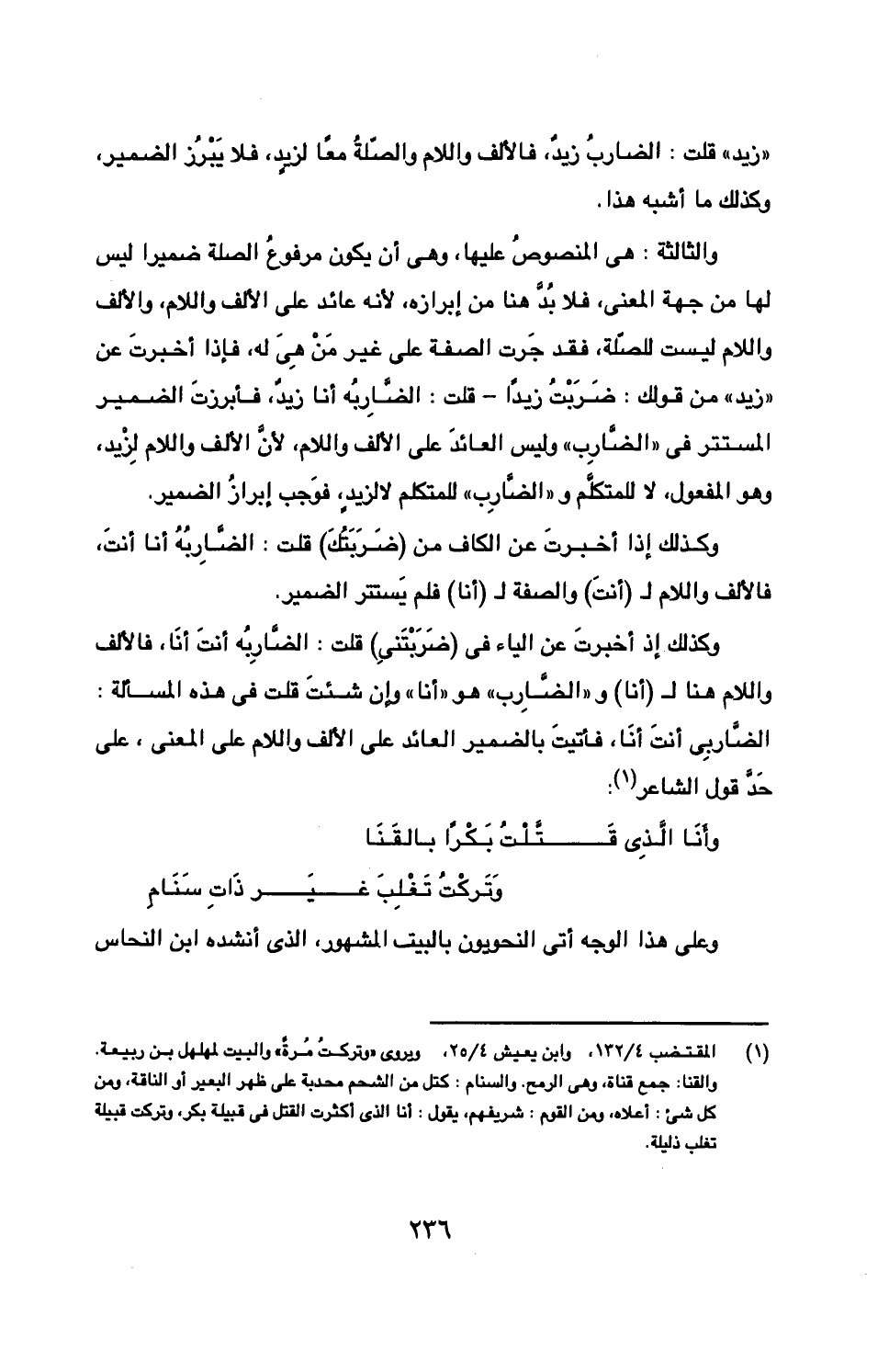 وكذلك إذا أخبرت عن الياء في (ضربتني) قلت: الضاربه أنت أنا، فالألف واللام هنا ل (أنا) و"الضارب" هو "أنا" وإن شئت قلت في هذه المسألة: الضاربي أنت أنا، فأتيت بالضمير العائد على الألف واللام على المعنى، على حد قول الشاعر: