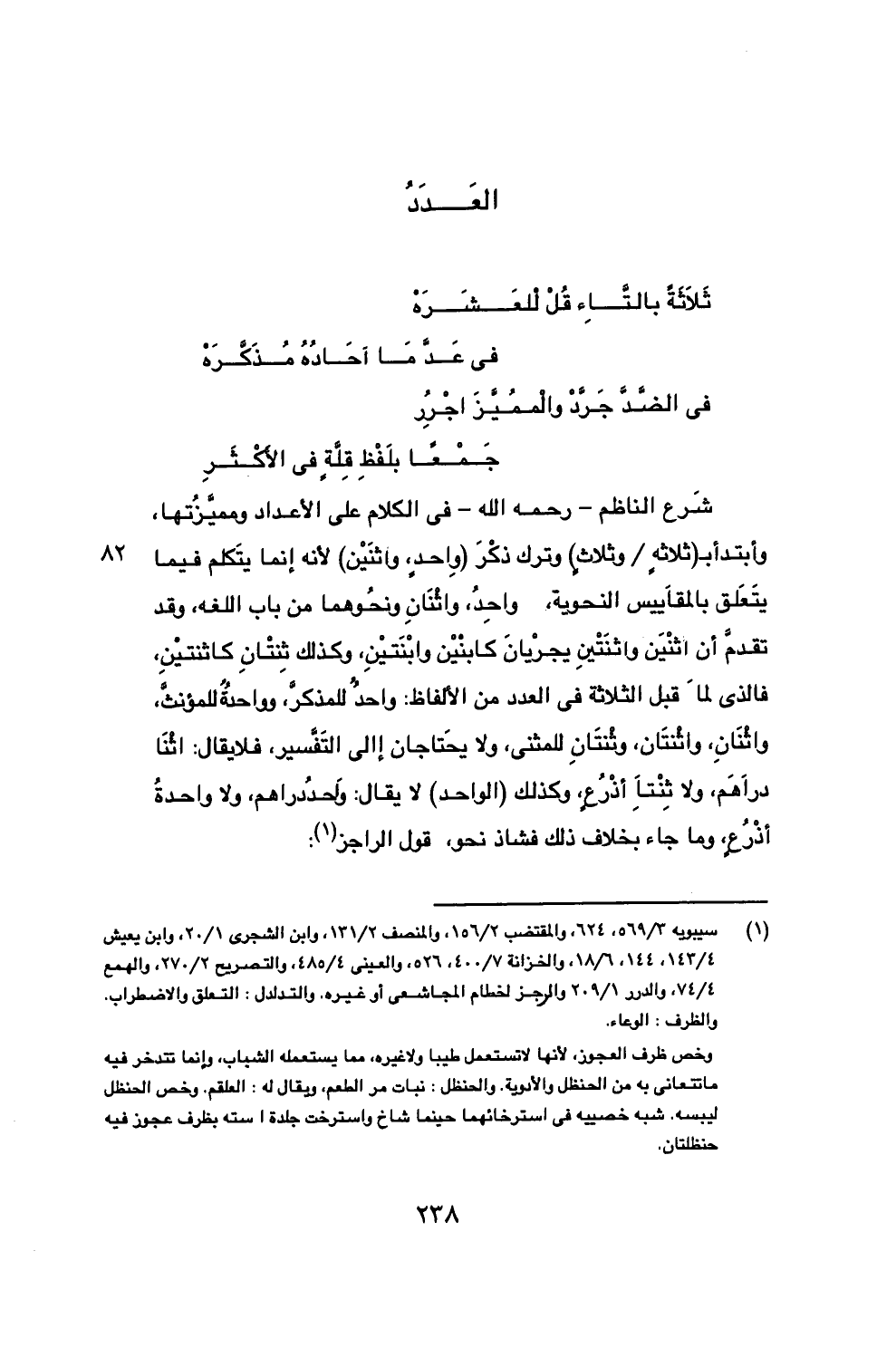 شرع الناظم- رحمه الله- في الكلام على الأعداد ومميزتها، وابتدأ ب (ثلاثه/ وثلاث) وترك ذكر (واحد، واثنين) لأنه إنما يتكلم فيما يتعلق بالمقاييس النحوية، واحد، واثنان ونحوهما من باب اللغة، وقد تقدم أن اثنين واثننتين يجريان كابنين وابنتين، وكذلك ثنتان كاثنتين، فالذي لما قبل الثلاثة في العدد من الألفاظ: واحد للمذكر، وواحدة للمؤنث، واثنان، واثنتان، وثنتان للمثنى، ولا يحتاجان إلى التفسير، فلا يقال: اثنا دراهم، ولا ثنتا أذرع، وكذلك (الواحد) لا يقال: واحد دراهم، ولا واحدة أذرع، وما جاء بخلاف ذلك فشاذ نحو، قول الراجز: