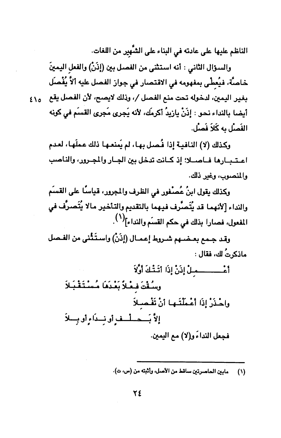 وكذلك يقول ابن عصفور في الظرف والمجرور، قياسا على القسم والنداء] لأنهما قد يتصرف فيهما بالتقديم والتأخير ما لا يتصرف في المفعول، فصارا بذلك في حكم القسم والنداء [.