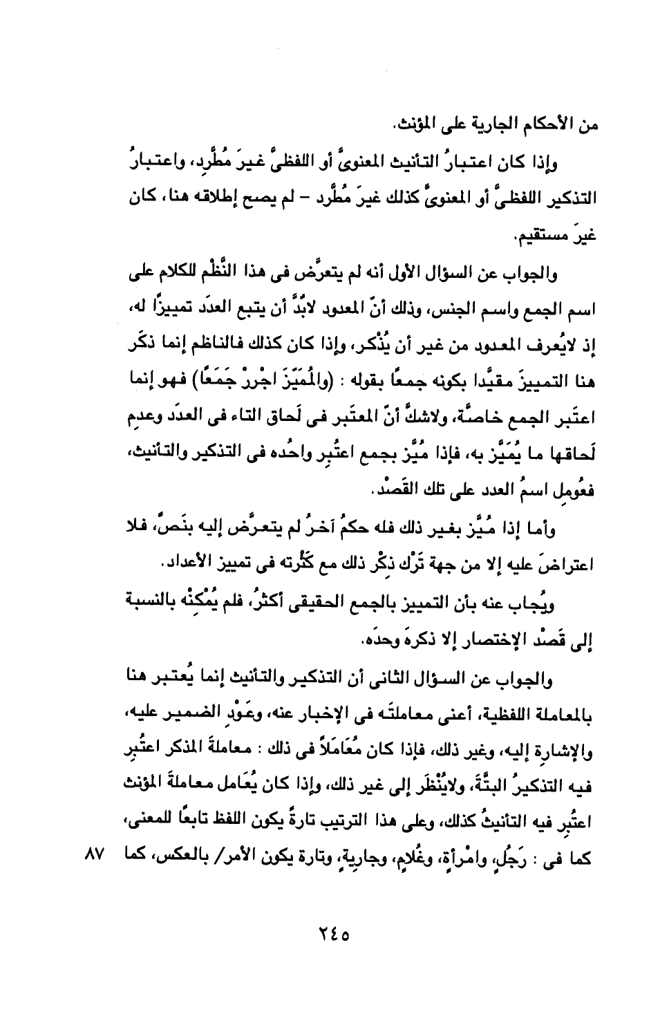 والجواب عن السؤال الثاني أن التذكير والتأنيث إنما يعتبر هنا بالمعاملة اللفظية، أعني معاملته في الإخبار عنه، وعود الضمير عليه، والإشارة إليه، وغير ذلك، فإذا كان معاملا في ذلك: معاملة المذكر اعتبر فيه التذكير البتة، ولا ينظر إلى غير ذلك، وإذا كان يعامل معاملة المؤنث اعتبر فيه التأنيث كذلك، وعلى هذا الترتيب تارة يكون اللفظ تابعا للمعنى، كما في: رجل وامرأة، وغلام، وجارية، وتارة يكون الأمر/ بالعكس، كما