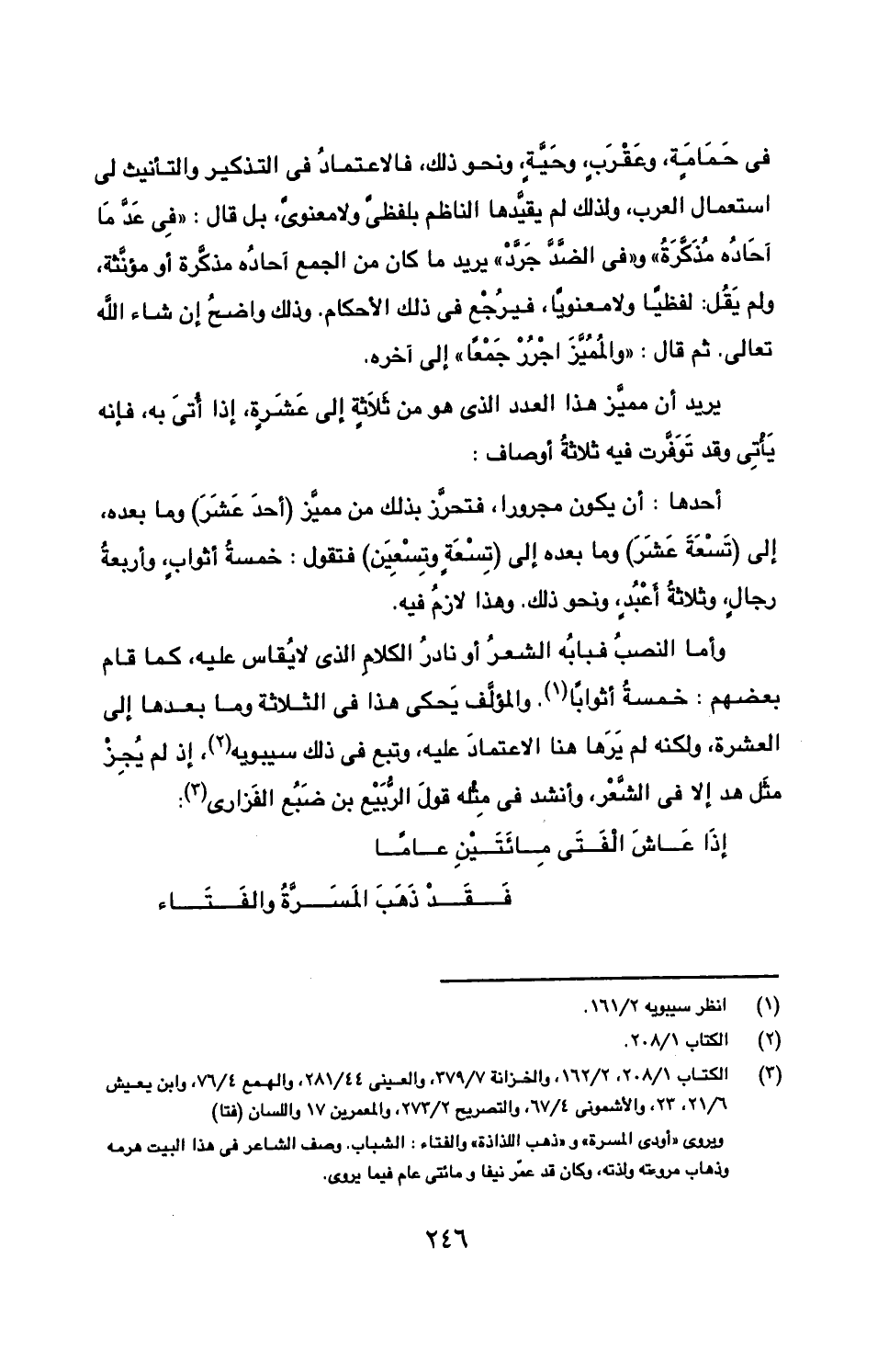 وأما النصب فبابه الشعر أو نادر الكلام الذي لا يقاس عليه، كما قام بعضهم: خمسة أثوابا. والمؤلف يحكي هذا في الثلاثة وما بعدها إلى العشرة، ولكنه لم يرها هنا الاعتماد عليه، وتبع في ذلك سيبويه، إذ لم يجز مثل هذا إلا في الشعر، وأنشد في مثله قول الربيع بن ضبع الفزاري.
