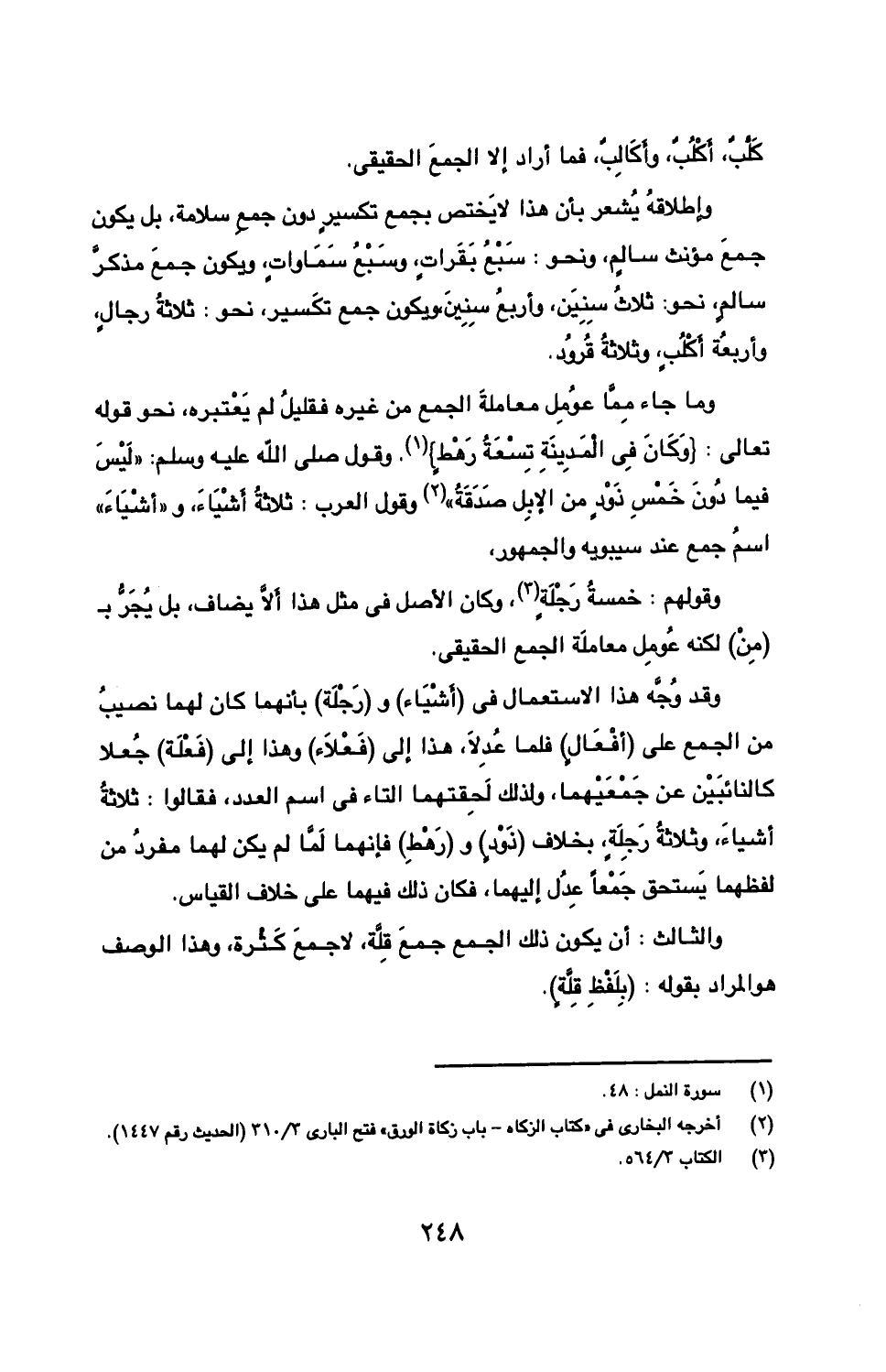 وإطلاقه يشعر بأن هذا لا يختص بجمع تكسير دون جمع سلامة، بل يكون جمع مؤنث سالم، ونحو: سبع بقرات، وسبع سماوات، ويكون جمع مذكر سالك، نحو: ثلاث سنين، وأربع سنين، ويكون جمع تكسير، نحو: ثلاثة رجال، وأربعة أكلب، وثلاثة قرود.