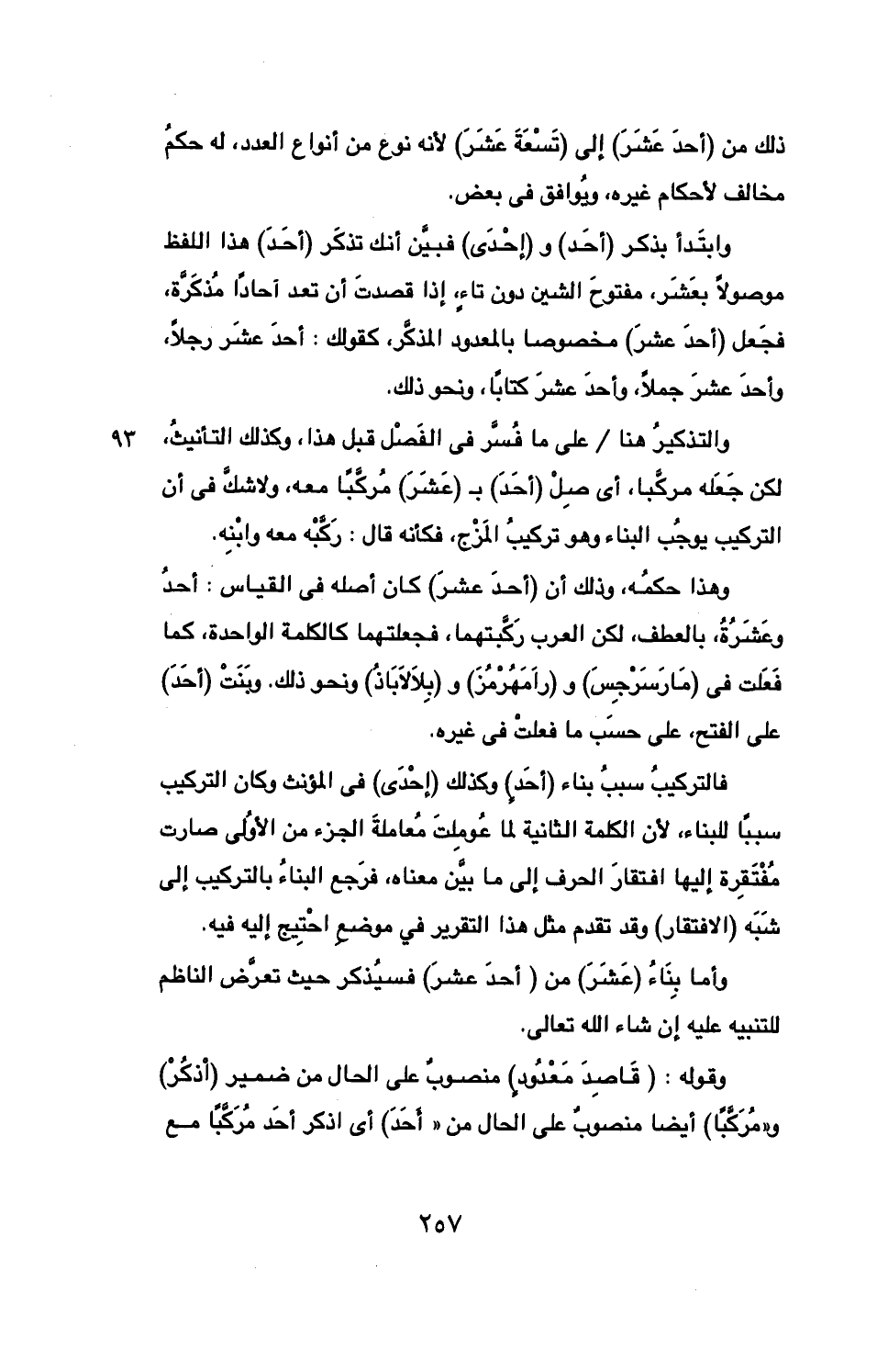 وهذا حكمه، وذلك أن (أحد عشر) كان أصله في القياس: أحد وعشرة، بالعطف، لكن العرب ركبتهما، فجعلتهما كالكلمة الواحدة، كما فعلت في (مارسرجس) و (رامهرمز) و (بلالاباذ) ونحو ذلك. وبنت (أحد) على الفتح، على حسب ما فعلت في غيره.