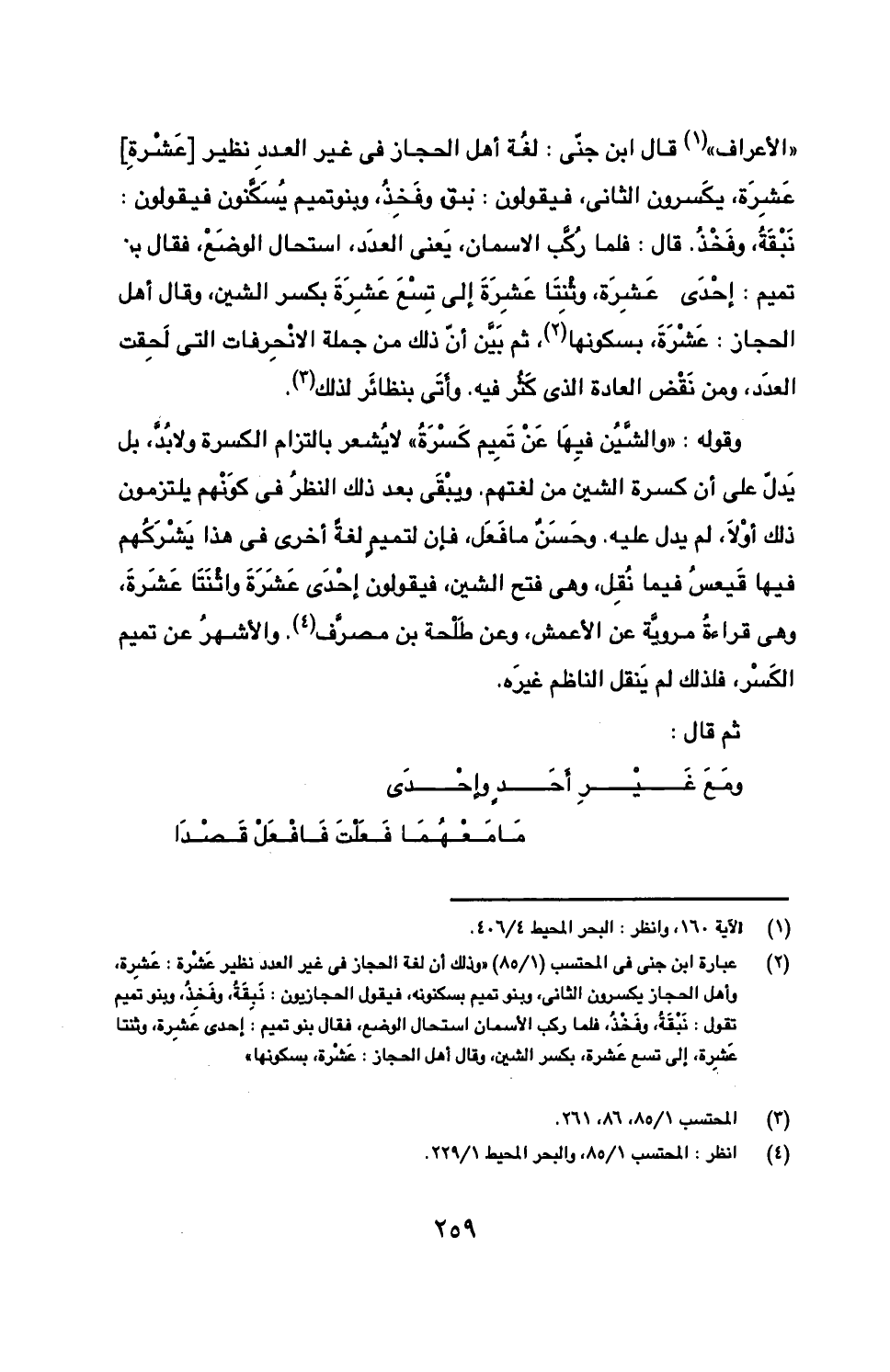 "الأعراف" قال ابن جنى: لغة أهل الحجاز في غير العدد نظير] عشرة [عشرة، يكسرون الثاني، فيقولون: نبق وفخذ، وبنو تميم يسكنون فيقولون: نبقة، وفخذ. قال: فلما ركب الأسمان، يعني العدد، استحال الوضع، فقال بني تميم: إحدى عشرة، وثنتا عشرة إلى تسع عشرة بكسر الشين، وقال أهل الحجاز: عشرة، بسكونها، ثم بين أن ذلك من جملة الانحرافات التي لحقت العدد، ومن نقض العادة الذي كثر فيه. وأتى بنظائر لذلك.