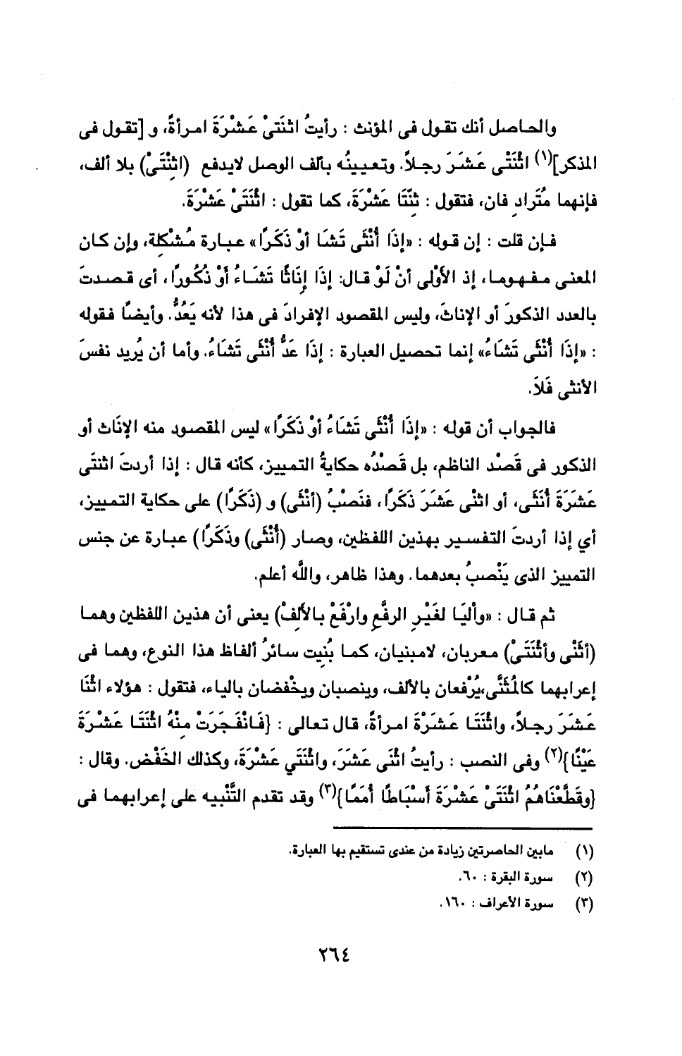 والحاصل أنك تقول في المؤنث: رأيت اثنتي عشرة امرأة، و] تقول في المذكر [اثنتي عشر رجلا. وتعيينه بألف الوصل لا يدفع (اثنتي) بلا ألف، فإنهما مترادفان فإن، فتقول: ثن عشرة، كما تقول: اثنتي عشرة.