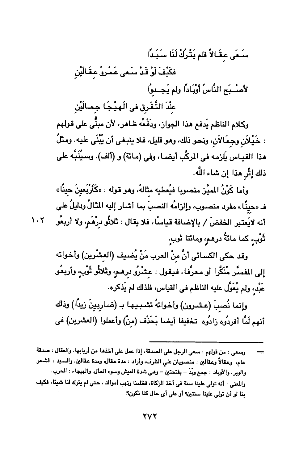 وقد حكى الكسائي أن من العرب من يضيف (العشرين) وأخواته إلى المفسر منكرا أو معرفا، فيقول: عشرو درهم، وثلاثو ثوب، وأربعو عبد، ولم يعول عليه الناظم في القياس، فلذلك لم يذكره.
