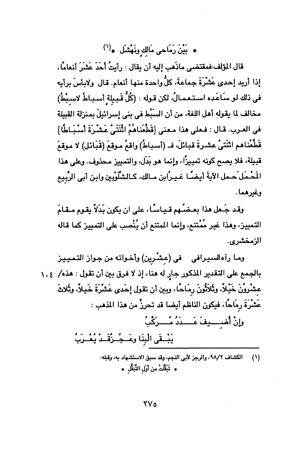 قال المؤلف: فمقتضى ما ذهب إليه أن يقال: رأيت أحد عشر أنعاما، إذا أريد إحدى عشرة جماعة، كل واحدة منها أنعام. قال ولا بأس برأيه في ذلك لو ساعده استعمال، لكن قوله: (كل قبيلة أسباط لا سبط) مخالف لما يقوله أهل اللغة، من أن السبط في بني إسرائيل بمنزلة القبيلة في العرب. قال: فعلى هذا معنى} قطعناهم اثنتي عشرة أسباطا} قطعناهم اثنتي عشرة قبائل، ف (أسباط) واقع موقع (قبائل) لا موقع قبيلة، فلا يصح كونه تمييزا، وإنما هو بدل، والتمييز محذوف. وعلى هذا المحمل حمل الآية أيضا غير ابن مالك، كالشلوبين وابن أبي الربيع وغيرهما.