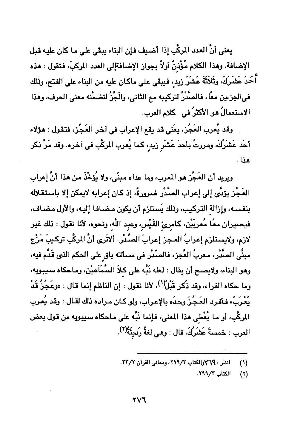 يعني أن العدد المركب إذا أضيف فإن البناء يبقى على ما كان عليه قبل الإضافة. وهذا الكلام مؤذن أولا بجواز الإضافة إلى العدد المركب، فتقول: هذه أحد عشرك، وثلاثة عشر زيد، فيبقى على ما كان عليه من البناء على الفتح، وذلك في الجزءين معا، فالصدر لتركيبه مع الثاني، والجز لتضمنه معنى الحرف، وهذا الاستعمال هو الأكثر في كلام العرب ..
