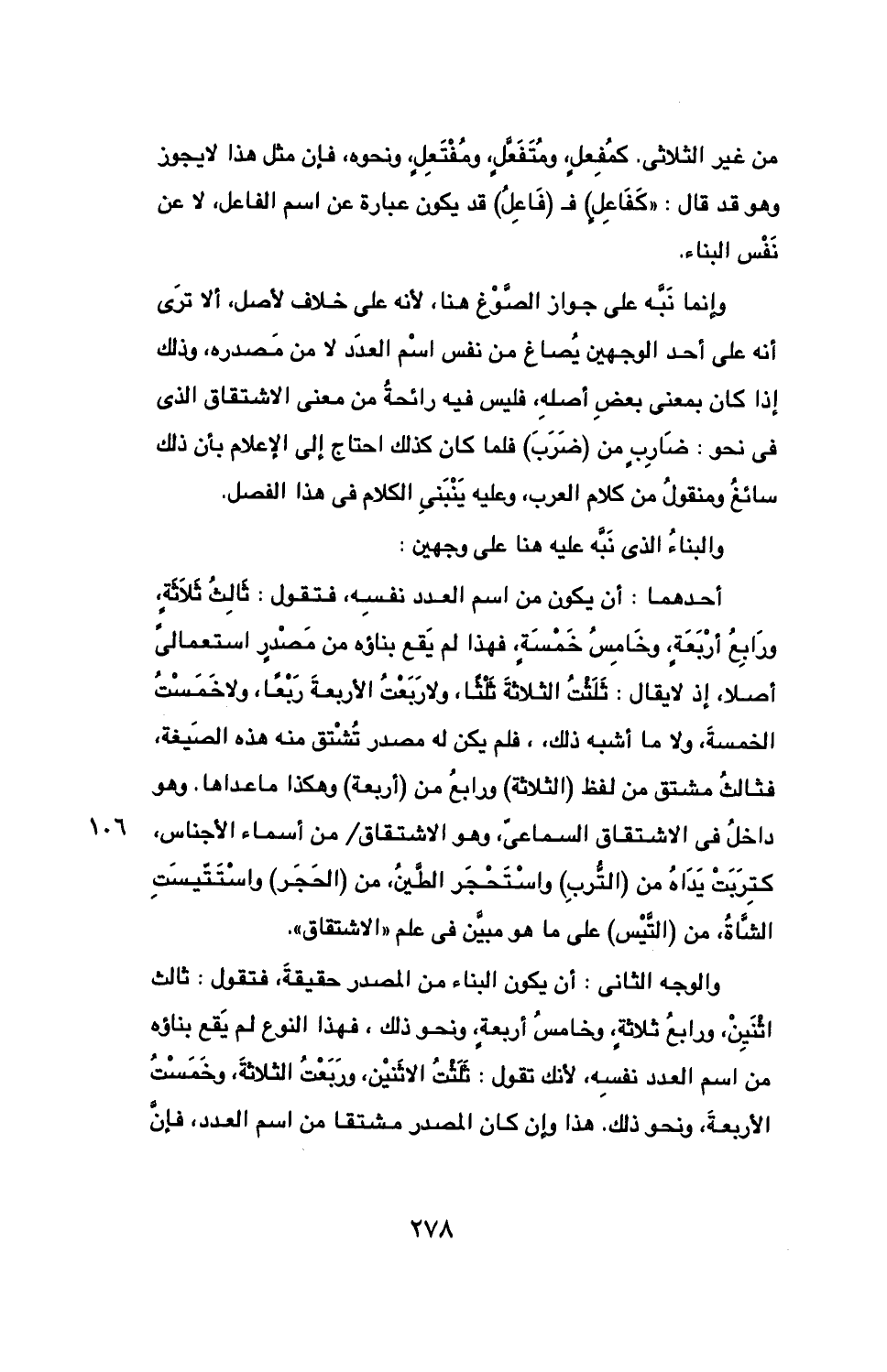 أحدهما: أن يكون من اسم العدد نفسه، فتقول: ثالث ثلاثة، ورابع أربعة، وخامس خمسة، فهذا لم يقع بناؤه من مصدر استعمالي أصلا، إذ لا يقال: ثلثت الثلاثة ثلثا، ولا ربعت الأربعة ربعا، ولا خمست الخمسة، ولا ما أشبه ذلك، فلم يكن له مصدر تشتق منه هذه الصيغة، فثالث مشتق من لفظ (الثلاثة) ورابع من (أربعة) وهكذا ما عداها. وهو داخل في الاشتقاق السماعي، وهو الاشتقاق / من أسماء الأجناس، كتربت يداه من (الترب) واستحجر الطين، من (الحجر) واستتيست الشاة، من (التيس) على ما هو مبين في علم "الاشتقاق".