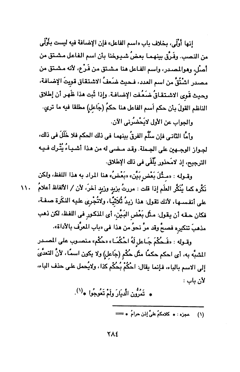 إنها أولى، بخلاف باب "اسم الفاعل"، فإن الإضافة فيه ليست بأولى من النصب، وفرق بينهما بعض شيوخنا بأن اسم الفاعل مشتق من أصل، وهو المصدر، واسم الفاعل هنا مشتق من فرع، لأنه مشتق من مصدر اشتق من اسم العدد، فحيث ضعف الاشتقاق قويت الإضافة، وحيث قوي الاشتقاق ضعفت الإضافة. وإذا ثبت هذا ظهر أن إطلاق الناظم القول بأن حكم اسم الفاعل هنا حكم (جاعل) مطلقا فيه ما ترى.