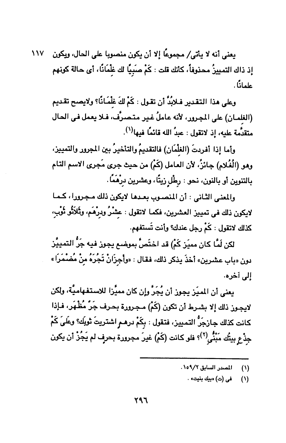 وأما إذا أفردت (الغلمان) فالتقديم والتأخير بين المجرور والتمييز، وهو (الغلام) جائز، لأن العامل (كم) من حيث جرى مجرى الاسم التام بالتنوين أو بالنون، نحو: رطل زيتا، وعشرين درهما.