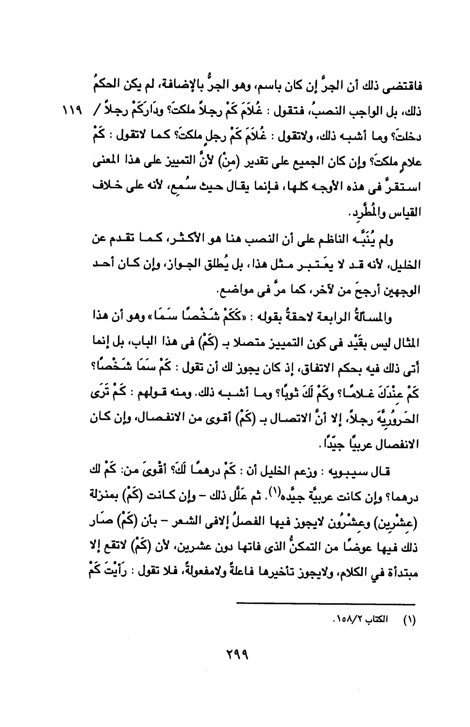 قال سيبويه: وزعم الخليل أن: كم درهما لك؟ أقوى من: كم لك درهما؟ وإن كانت عربية جيده. ثم علل ذلك- وإن كانت (كم) بمنزلة (عشرين) وعشرون لا يجوز فيها الفصل إلا في الشعر- بأن (كم) صار ذلك فيها عوضا من التمكن الذي فاتها دون عشرين، لأن (كم) لا تقع إلا مبتدأة في الكلام، ولا يجوز تأخيرها فاعلة ولا مفعولة، فلا تقول: رأيت كم