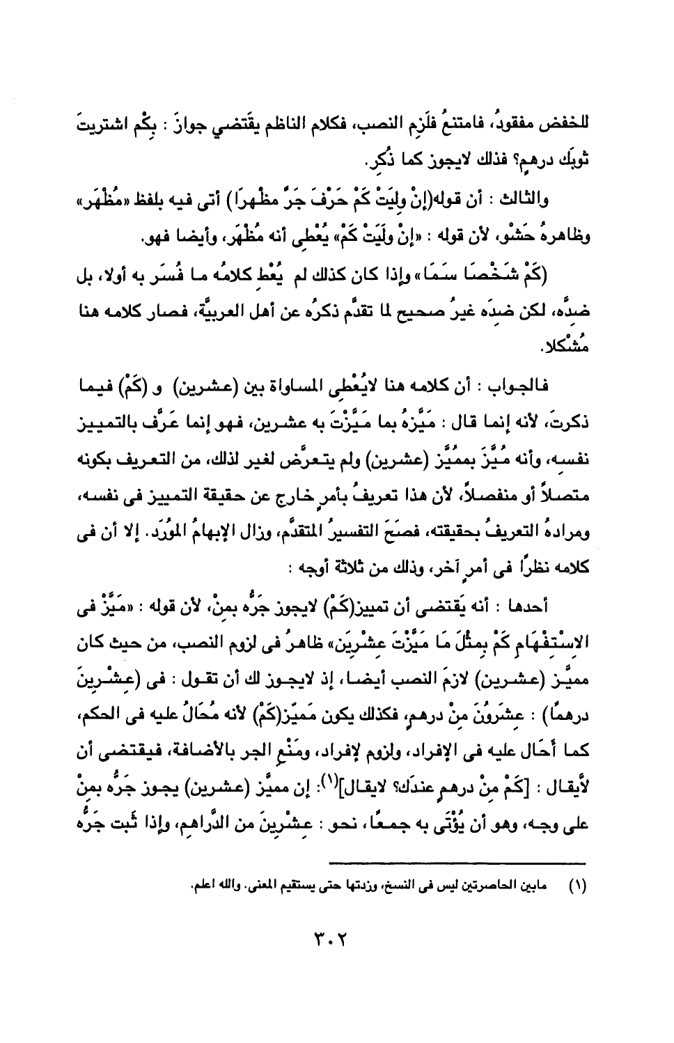 فالجواب: أن كلامه هنا لا يعطي المساواة بين (عشرين) و (كم) فيما ذكرت، لانه إنما قال: ميزه بما ميزت به عشرين، فهو إنما عرف بالتمييز نفسه، وأنه ميز بمميز (عشرين) ولم يتعرض لغير لذلك، من التعريف بكونه متصلا أو منفصلا، لأن هذا تعريف بأمر خارج عن حقيقة التمييز في نفسه، ومراده التعريف بحقيقته، فصح التفسير المتقدم، وزال الإبهام المورد. إلا أنن في كلامه نظرا في أمر آخر، وذلك من ثلاثة أوجه: