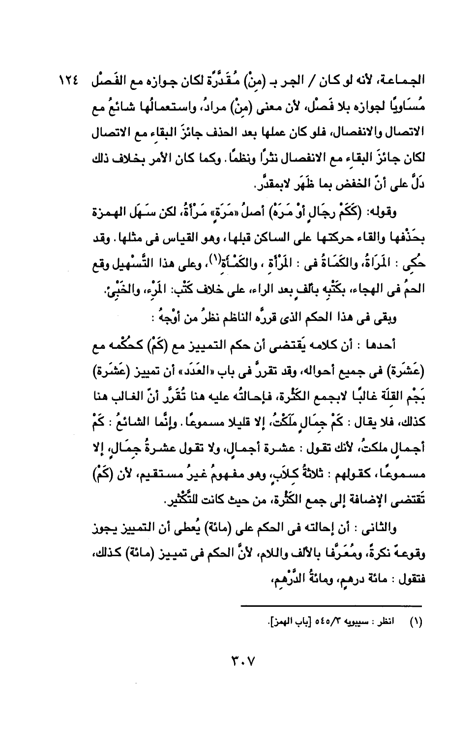 وقوله: (ككم رجال أو مره) أصل "مرة" مرأة، لكن سهل الهمزة بحذفها والقاء حركتها على الساكن قبلها، وهو القياس في مثلها. وقد حكى: المراة، والكمأة في: المرأة، والكمأة، وعلى هذا التسهيل وقع الحم في الهجاء، بكتبه بألف بعد الراء، على خلاف كتب: المرء، والخبئ.