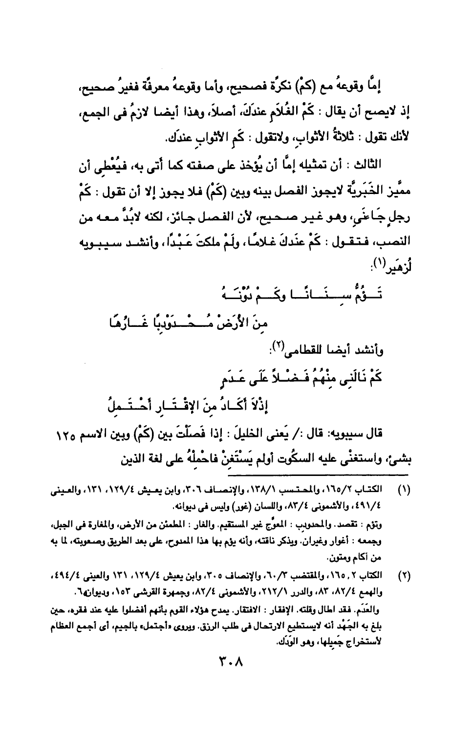 الثالث: أن تمثيله إما أن يؤخذ على صفته كما أتى به، فيعطى أن مميز الخبرية لا يجوز الفصل بينه وبين (كم) فلا يجوز إلا أن تقول: كم رجل جائني، وهو غير صحيح، لأن الفصل جائز، لكنه لا بد معه من النصب، فتقول: كم عندك غلاما، ولم ملكت عبدا، وأنشد سيبويه لزهير: