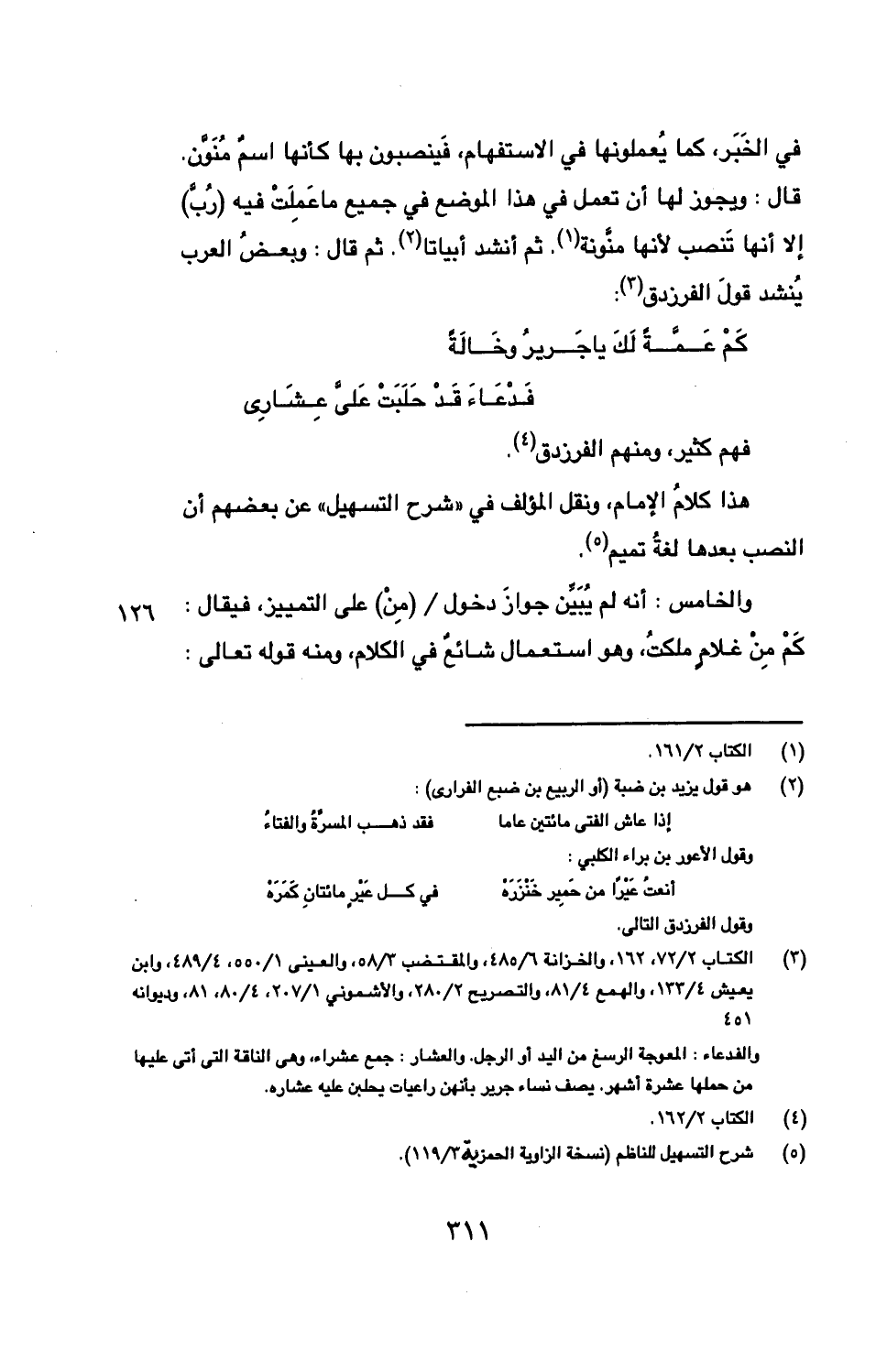 في الخبر، كما يعملونها في الاستفهام، فينصبون بها كأنها اسم منون. قال: ويجوز لها أن تعمل في هذا الموضع في جميع ما عملت فيه (رب) إلا أنها تنصب لأنها منونة ثم أنشد أبياتا. ثم قال: وبعض العرب ينشد قول الفرزدق: