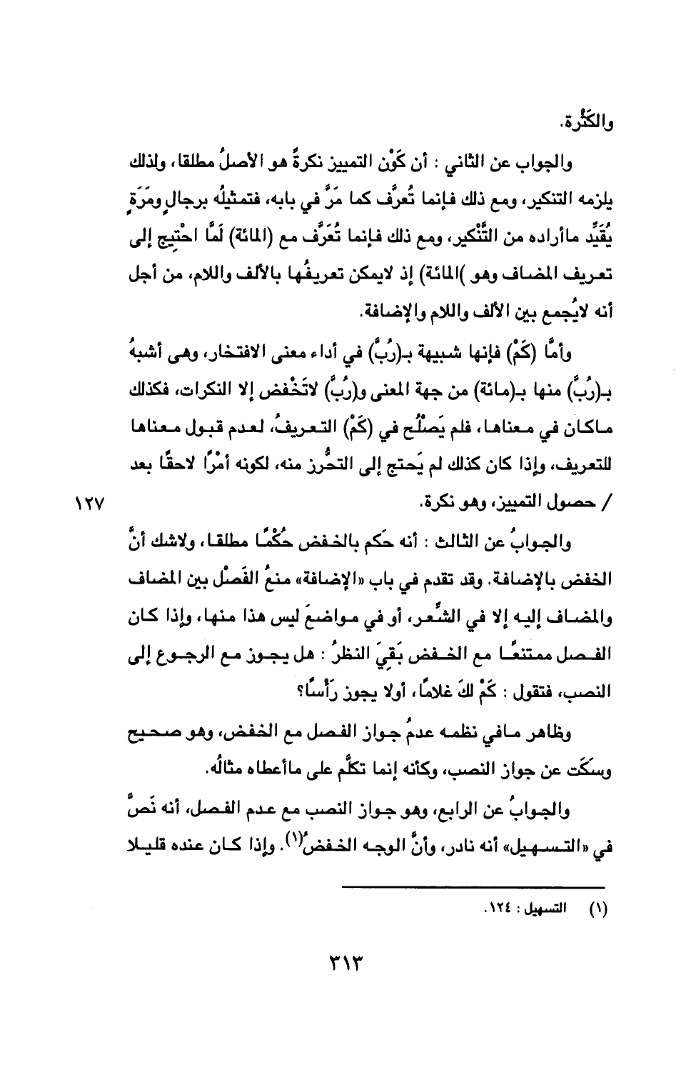 والجواب عن الثاني: أن كون التمييز نكرة هو الأصل مطلقًا، ولذلك يلزمه التنكير، ومع ذلك فإنما تعرف كما مر في بابه، فتمثيله برجال ومرة يقيد ما أراده من التنكير، ومع ذلك فإنما تعرف مع (المائة) لما احتيج إلى تعريف المضاف وهو (المائة) إذ لا يمكن تعريفها بالألف واللام، من أجل أنه لا يجمع بين الألف واللام والإضافة.