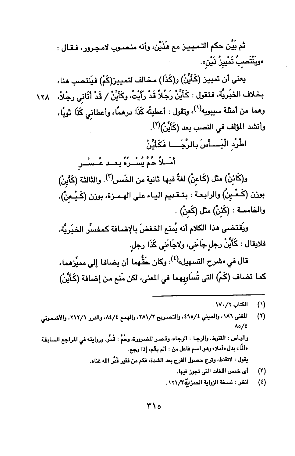 و(كائن) مثل (كاعن) لغة فيها ثانية من الخمس. والثالثة (كأين) بوزن (كعين) والرابعة: بتقديم الياء على الهمزة، بوزن (كيعن). والخامسة: (كئن) مثل (كعن).