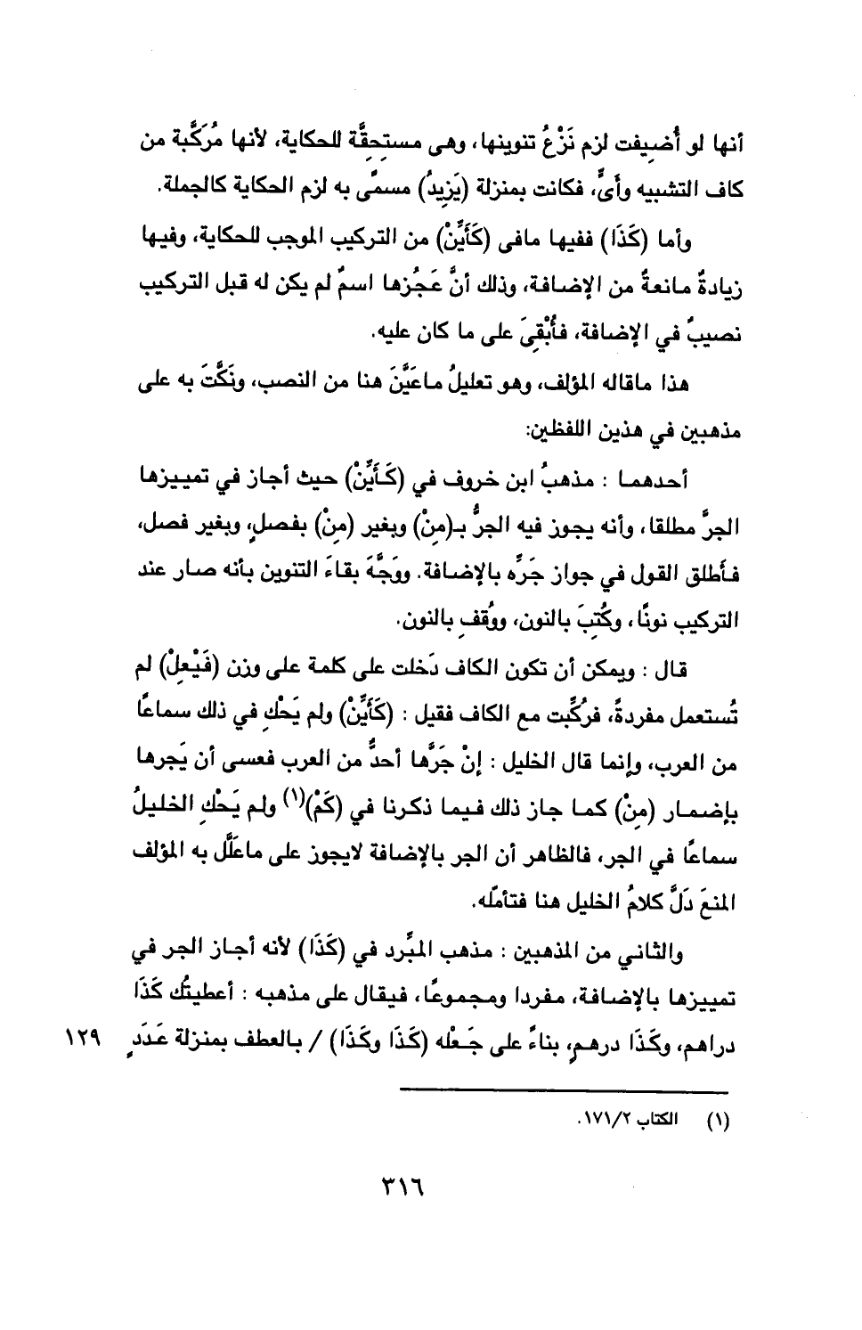 أحدهما: مذهب ابن خروف في (كأين) حيث أجاز في تمييزها الجر مطلقًا، وأنه يجوز فيه الجر بـ (من) وبغير (من) بفصل، وبغير فصل، فأطلق القول في جواز جره بالإضافة. ووجه بقاء التنوين بأنه صار عند التركيب نونًا، وكتب بالنون، ووقف بالنون.