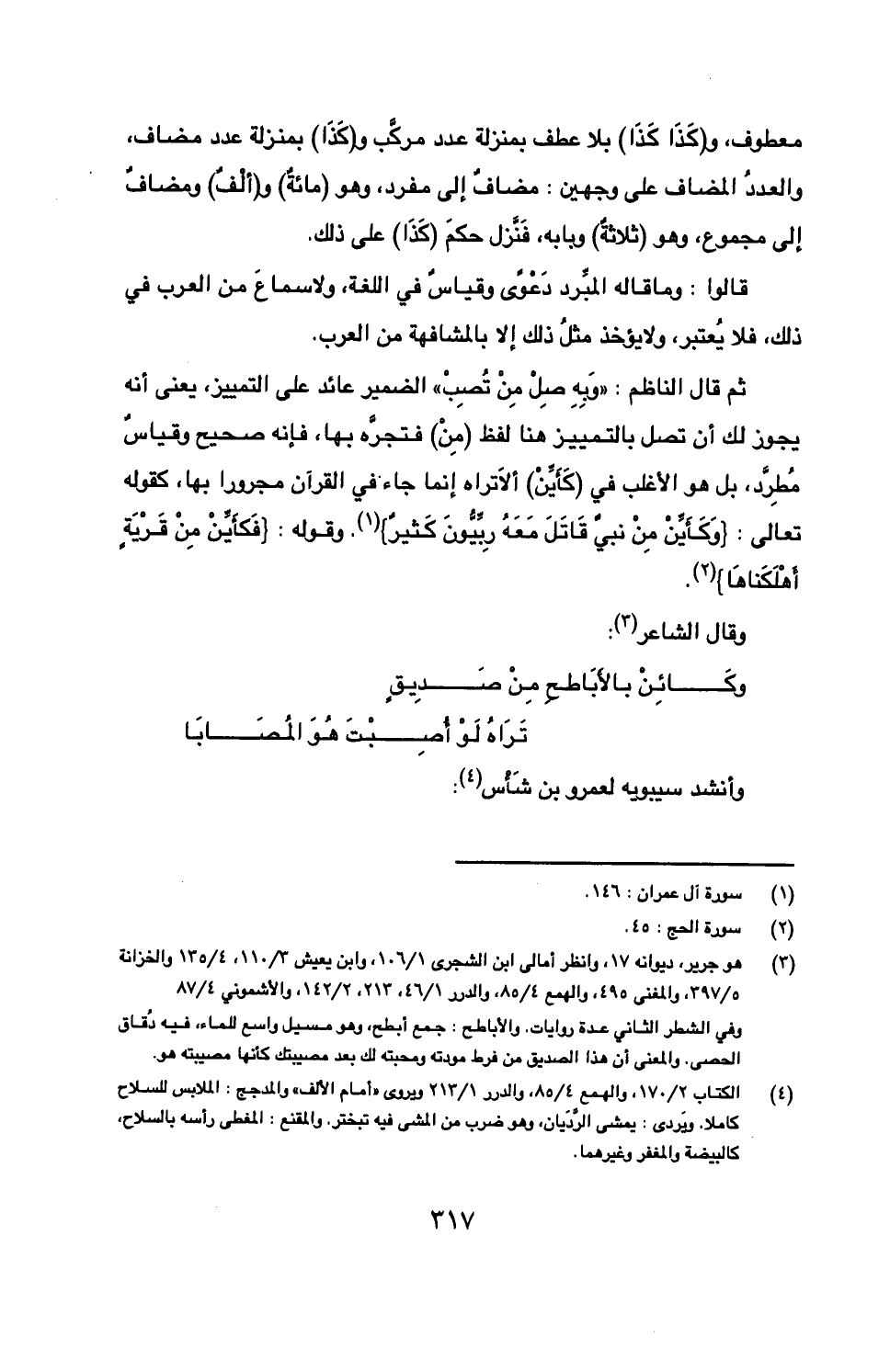 ثم قال الناظم: "وبه صل من تصب" الضمير عائد على التمييز، يعني أنه يجوز لك أن تصل بالتمييز هنا لفظ (من) فتجره بها، فإنه صحيح وقياس مطرد، بل هو الأغلب في (كأين) ألا تراه إنما جاء في القرآن مجرورًا بها، كقوله تعالى: } وكأين من نبي قاتل معه ربيون كثير}. وقوله: } فكأين من قرية أهلكناها}.