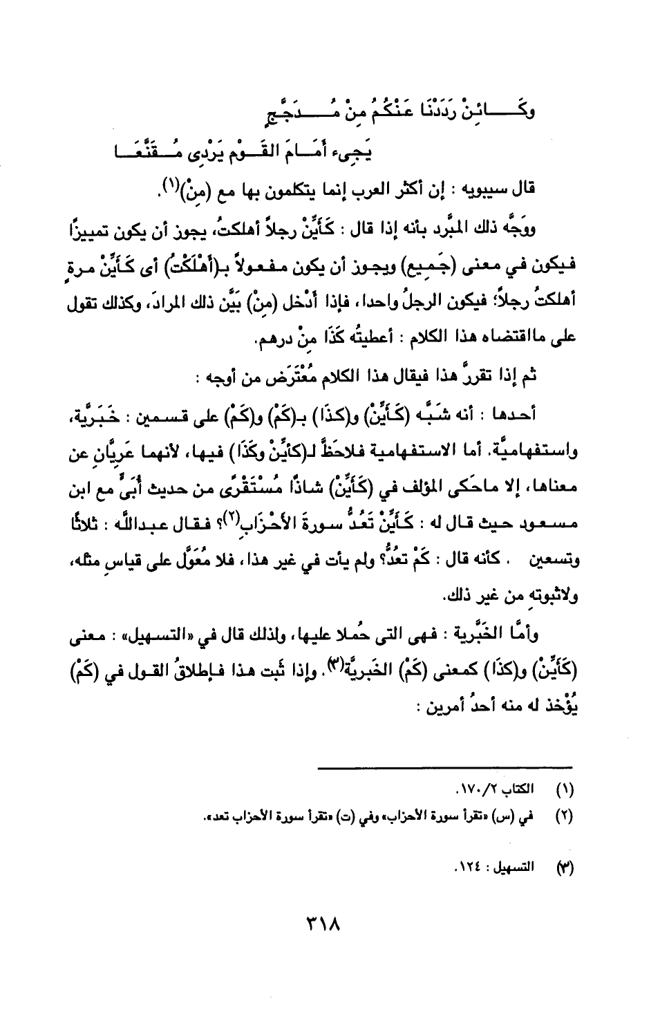 أحدها: أنه شبه (كأين) و (كذا) بـ (كم) و (كم) على قسمين: خبرية، واستفهامية. أما الاستفهامية فلاحظ لـ (كأين وكذا) فيها، لأنهما عريان عن معناها، إلا ما حكى المؤلف في (كأين) شاذًا مستقري من حديث أبي مع ابن مسعود حيث قال له: كأين تعد سورة الأحزاب؟ فقال عبد الله: ثلاثًا وتسعين. كأنه قال: كم تعد؟ ولم يأت في غير هذا، فلا معول على قياس مثله، ولا ثبوته من غير ذلك.