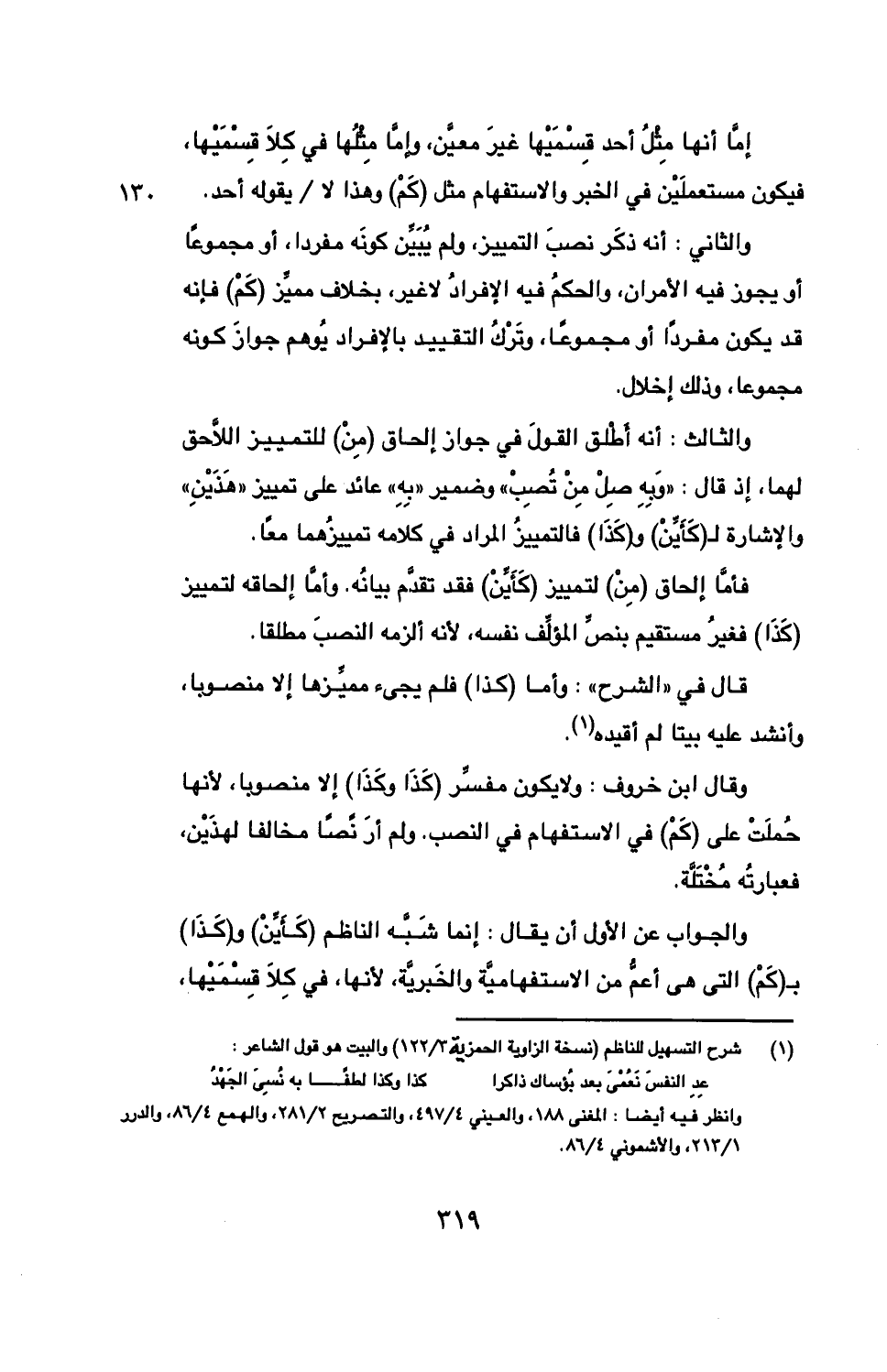 والجواب عن الأول أن يقال: إنما شبه الناظم (كأين) و (كذا) بـ (كم) التي هي أعم من الاستفهامية والخبرية، لأنها، في كلا قسميها،