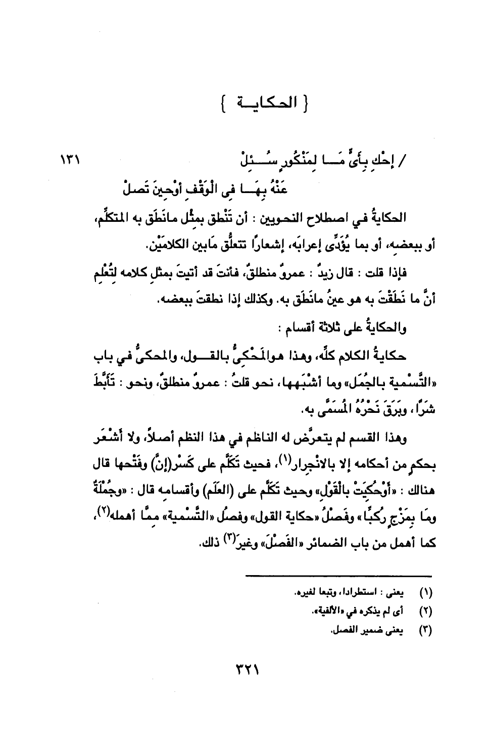 وهذا القسم لم يتعرض له الناظم في هذا النظم أصلاً، ولا أشعر بحكم من أحكامه إلا بالانجرار، فحيث تكلم على كسر (إن) وفتحها قال هنالك: "أو حكيت بالقول" وحيث تكلم على (العلم) وأقسامه قال: "وجملة وما بمزج ركبا" وفصل "حكاية القول" وفصل "التسمية" مما أهمله، كما أهمل من باب الضمائر "الفصل" وغير ذلك.