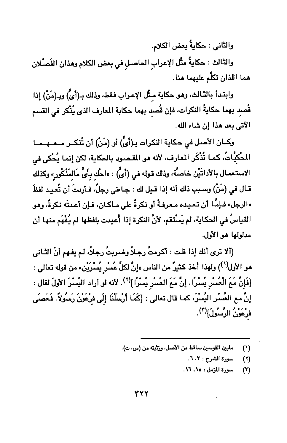 وابتدأ بالثالث، وهو حكاية مثل الإعراب فقط، وذلك بـ (أي) وبـ (من) إذا قصد بهما حكاية النكرات، فإن قصد بهما حكاية المعارف الذي يذكر في القسم الآتي بعد هذا إن شاء الله.